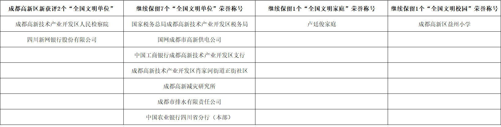 5月23日,全国精神文明建设表彰大会在北京召开,中央宣传思想文化工作领导小组决定,授予202个城市(区)全国文明城市(区)称号,授予3316个村镇全国文明村镇称号,授予4688个单位全国文明单位称号,授予798户家庭全国文明家庭称号,授予890所学校全国文明校园称号;授予60名(组)同志第九届全国道德模范荣誉称号,授予239名(组)同志第九届全国道德模范提名奖。其中,成都高新区新获评2个“全国文明单位”,并继续保留7个“全国文明单位”、1个“全国文明家庭”和1个“全国文明校园”荣誉称号,充分展现了区域精神文明建设的丰硕成果。