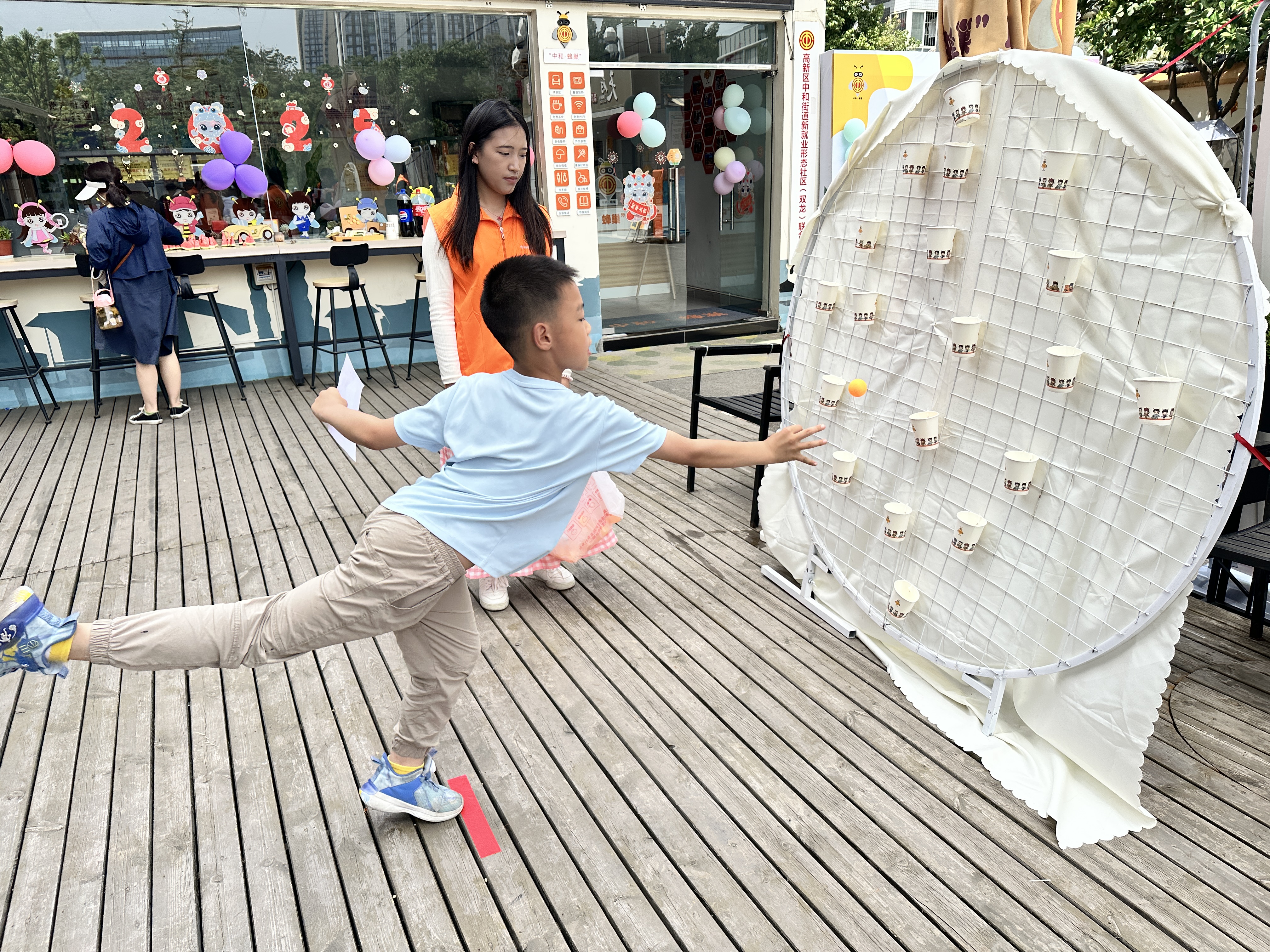 活动现场设置五大主题互动区域,兼具传统民俗与现代创意。在掷沙包大比拼区域,孩子们紧握沙包屏气瞄准,家长在旁轻声指引;母鸡下蛋竞技赛中,家长腰间绑着“母鸡道具”快速抖动,彩球如“鸡蛋”般倾泻而出,孩子蹲地捡拾时发出阵阵爽朗笑声;金球接福投掷赛里,家庭组合分站两端,金色小球在空中划出弧线,精准落入筐中;无敌乾坤圈挑战赛前,孩子们踮脚投掷彩色圈环,乒乓球接力闯关环节中,家长与孩子则用球拍合力运送小球……
