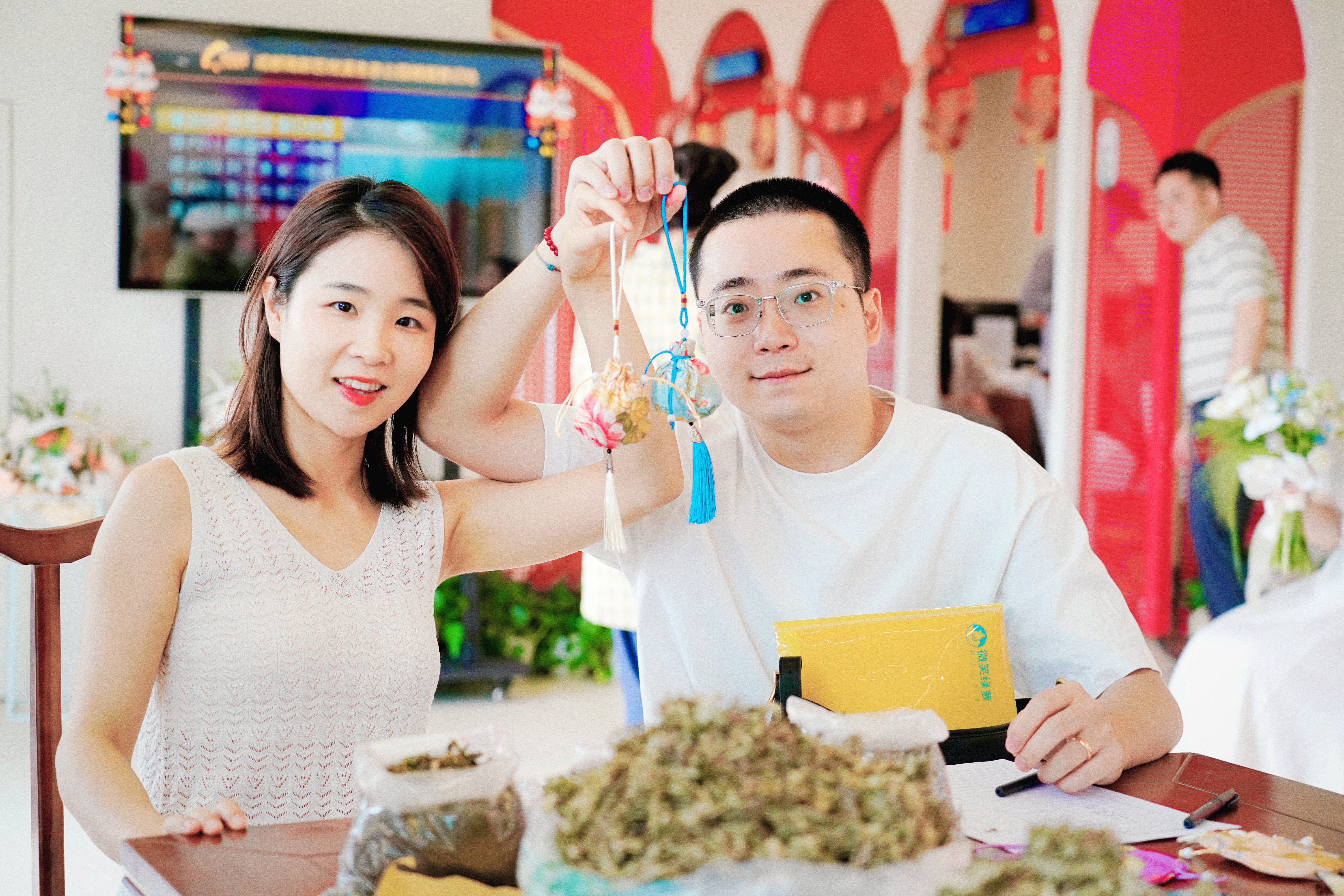活动中,完成登记的新人们携手投入端午香囊制作,在协作中勾勒未来生活的图景。中草药填充、五彩丝线缠绕,每一道工序都承载着对婚姻的祝福。新娘吴女士举起与爱人共同完成的香囊笑言:“这是我们婚姻的第一个‘合作项目’,比想象的更有意义。”活动现场,端午的祈福纳祥与传统婚俗文化交融,增添了独特仪式感。