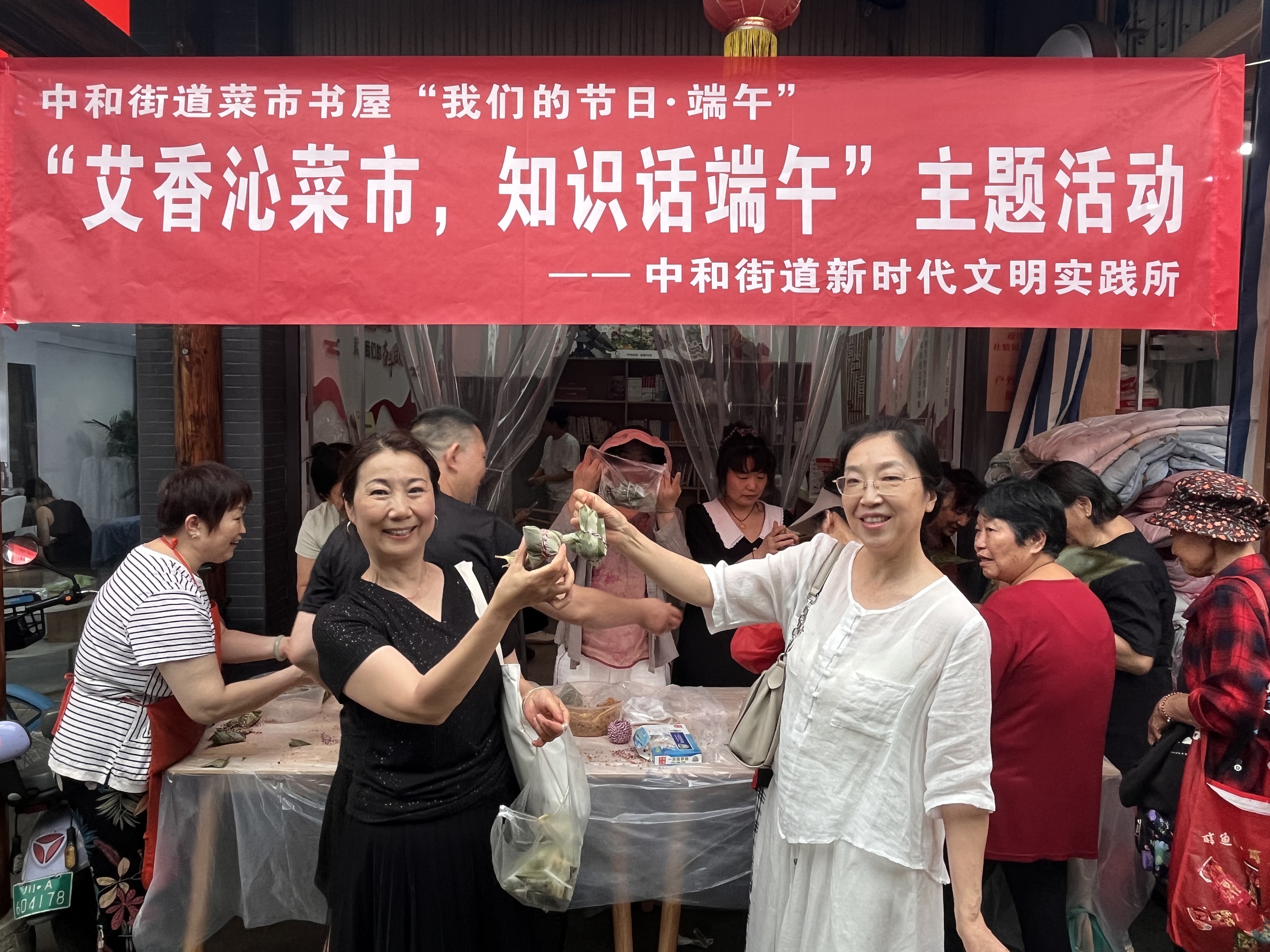 为传承优秀传统文化、培育文明风尚,近日,中和街道新时代文明实践所在锦尘街坊菜市书屋开展了“我们的节日·端午”——“艾香沁菜市·知识话端午”主题活动,以“文明集市”形式将文化传承融入市井生活。