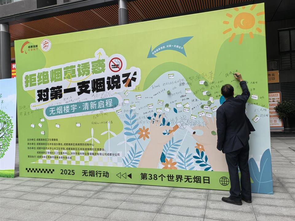 5月30日,由成都高新区卫生健康局主办,石羊街道办事处、成都高新区疾病预防控制中心等单位联合承办的“拒绝烟草诱惑,对第一支烟说不——无烟楼宇・清新启程”世界无烟日主题活动在天府新谷举行。活动聚焦无烟楼宇建设与企业职工控烟工作,通过科普宣教、趣味互动等形式,吸引楼宇企业职工300余人参与,现场征集拒烟承诺签名300余份,为商务楼宇控烟工作树立健康示范标杆。