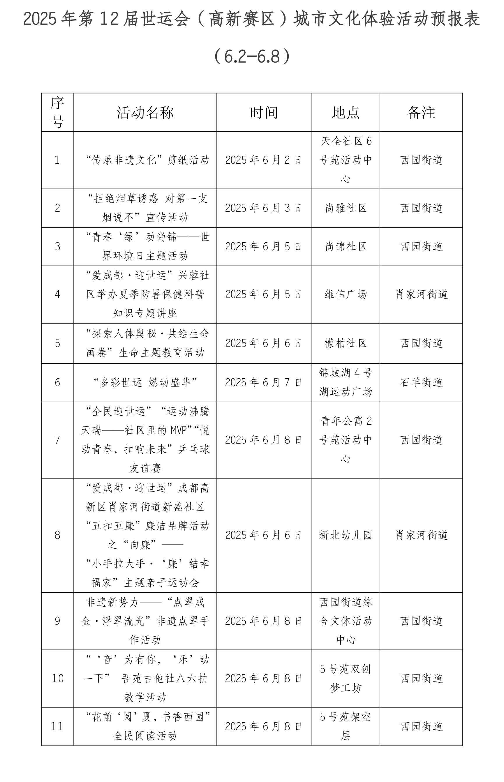 首周热潮未歇,文化盛宴继续。6月2日至8日,成都高新区各街道将推出11场世运主题文化活动,市民可通过各街道、社区官方平台获取具体活动信息,参与家门口的精彩活动。