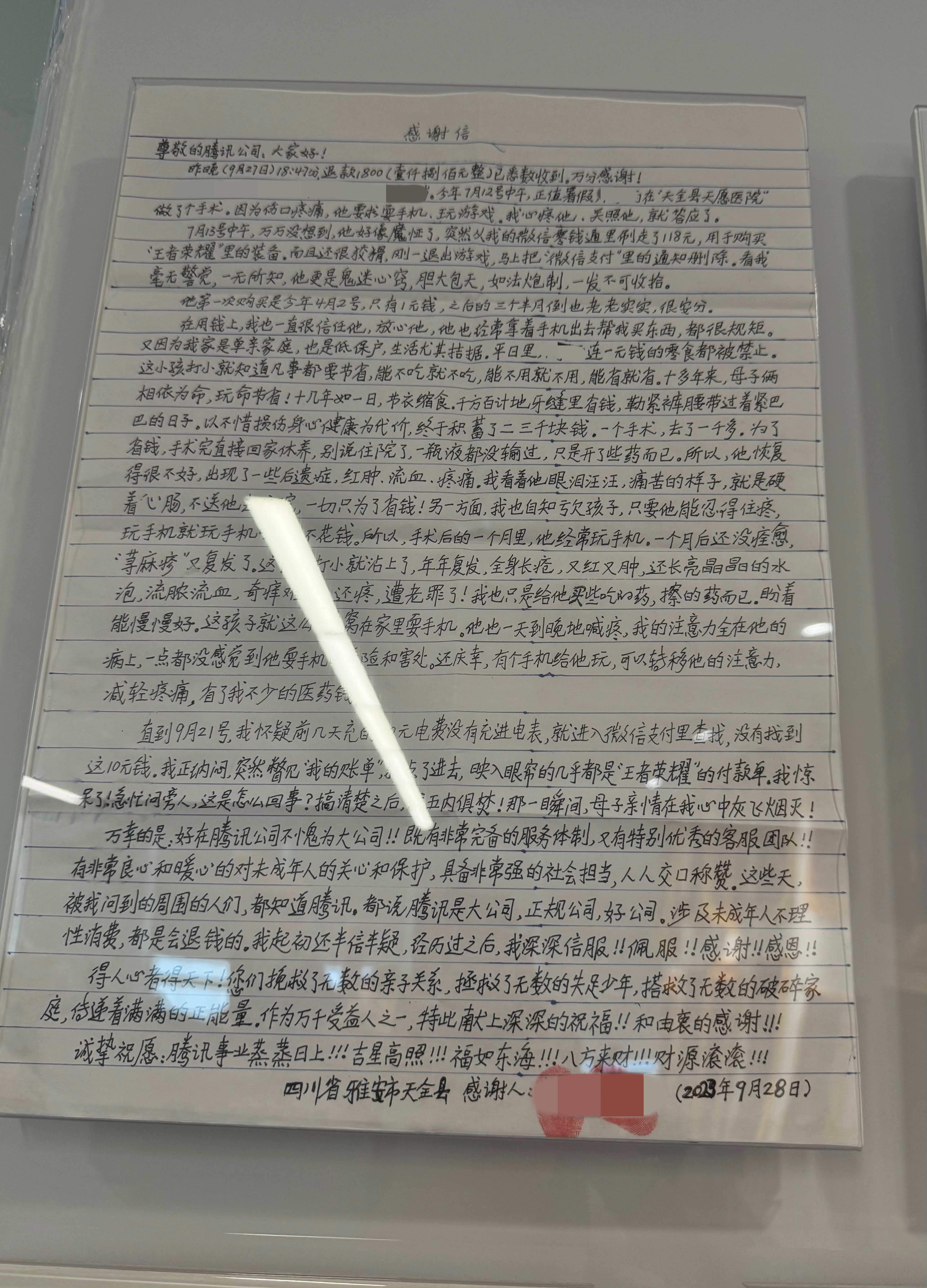 从2017年腾讯客服未成年人保护营地成立以来,她和团队也在积极践行着这句话。在腾讯客服未成年人保护营地的办公室里,记者看到了一封封来自全国各地的“感谢信”——“不幸的是,我在孩子教育和管理中出了这么大的纰漏,幸运的是,在处理事情过程中,遇到了您这样善良、可爱的人。谢谢您在我最难熬的时候给了我最暖心的安慰和最尽心的帮助。”“腾讯不愧为大公司,你们对未成年人的保护和关心,挽救了无数的亲子关系,拯救了无数未成年人,作为万千受益者之一,献上由衷的感谢!”……