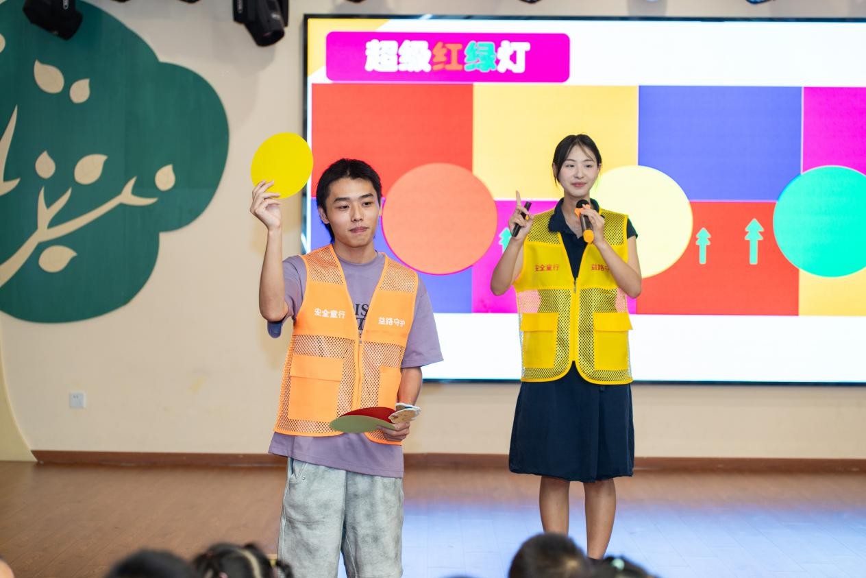 课堂打破单向灌输模式,通过“超级红绿灯”游戏让孩子们亲身体验交通规则,趣味问答环节更是点燃了小朋友们的参与热情。一只只高举的小手、一声声稚嫩地回答,孩子们与志愿者积极互动,现场气氛热烈活跃。