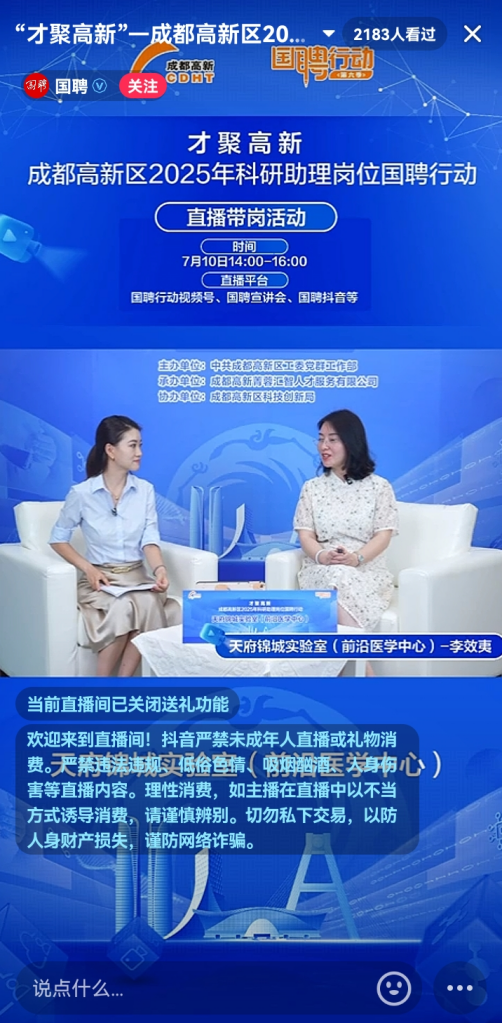 “国聘行动”是由教育部等七部门共同发起的重点群体促就业活动,本次成都高新区2025年科研助理岗位国聘行动直播带岗以“演播室+嘉宾访谈”的形式,在国聘融媒体矩阵平台上进行,通过介绍企业概况、招聘岗位、薪资福利、晋升通道、发展前景等,实现云端岗位推介、精准引才。