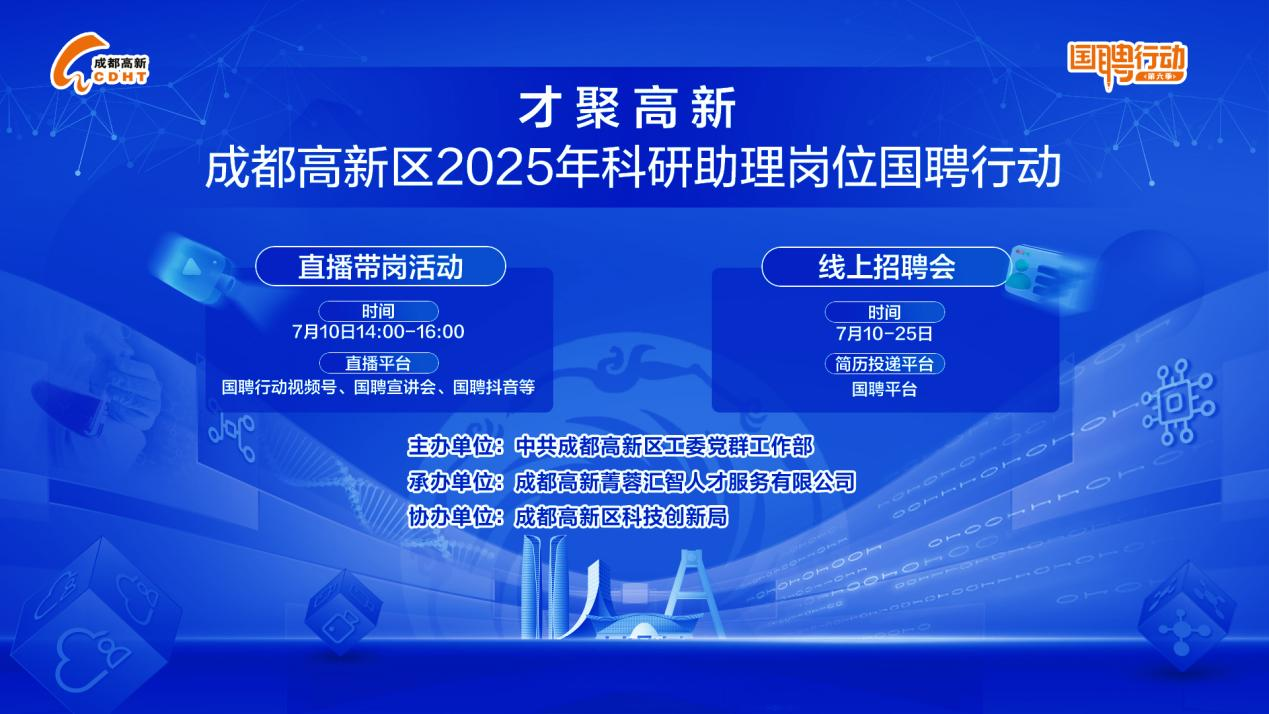 7月10日,“才聚高新”——成都高新区2025年科研助理岗位国聘行动正式启动。此次活动分为直播带岗和线上招聘会两部分,向全国优秀人才发出招引“最强音”。