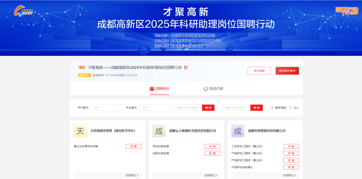 求职者只需登录“国聘”客户端并进入“招聘会”专区,点击进入“‘才聚高新’——成都高新区2025年科研助理岗位国聘行动”,即可查看本次线上招聘会的全部岗位,并进行简历投递。