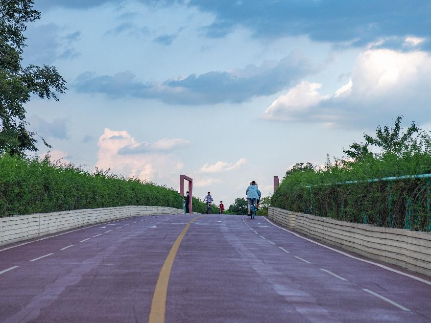 7月10日,天府鸿锦南桥。黄昏时分,市民们在成都绕城绿道上骑行,留下惬意的身影。