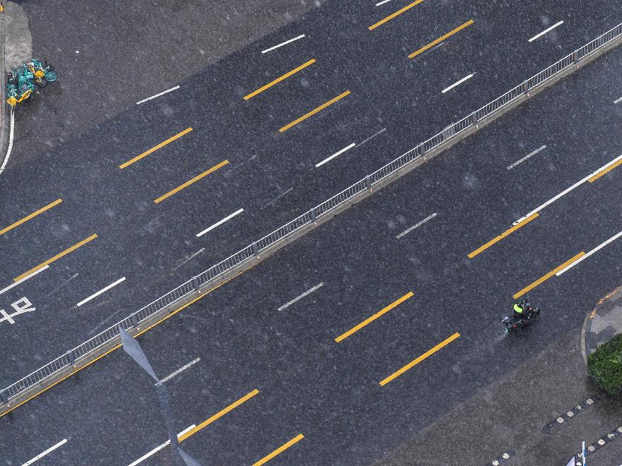 7月11日,天府五街。一场大雨突然袭来,行人匆匆散去躲雨,有一辆摩托车仍然从容行驶在路面上,划出别样的风景线。