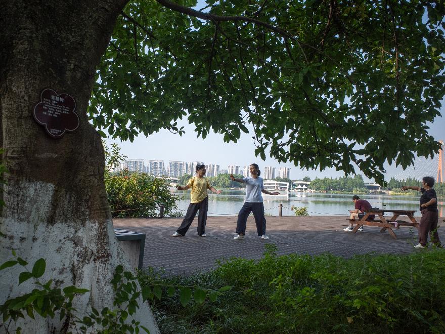 7月10日,锦城湖公园。一棵黄葛树下,晨练的市民一边活动筋骨,一边交流心得。