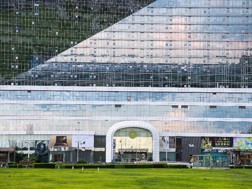 7月10日,环球中心。建筑外立面如镜面般,倒映着独特的晚霞。