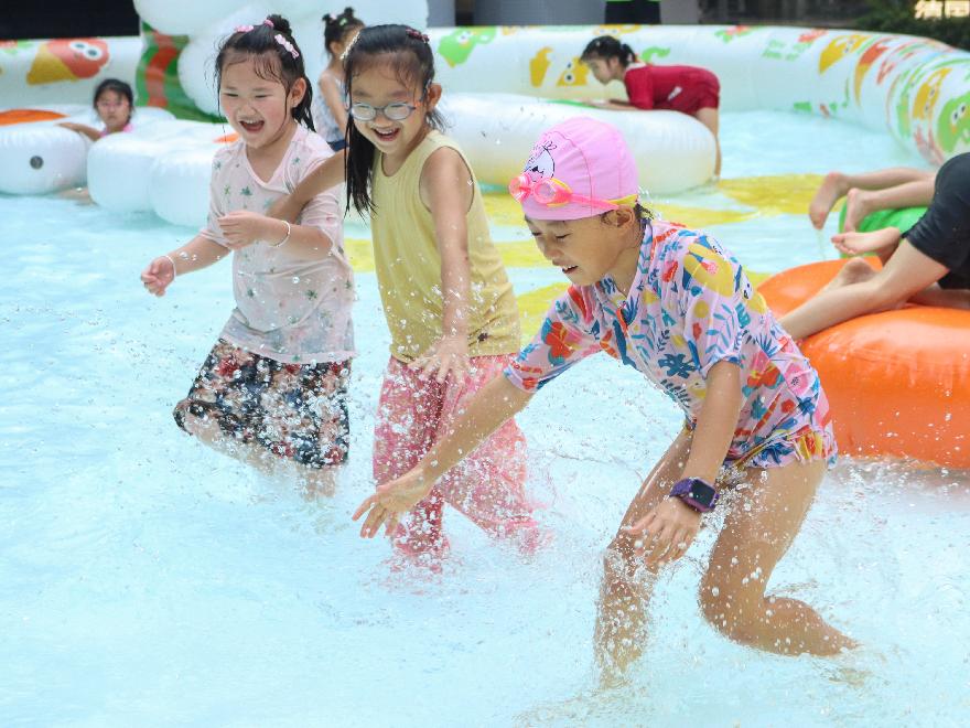 7月11日,港汇天地下沉广场。孩子们在清凉的水池里玩水嬉戏,充满了夏日的欢乐氛围。