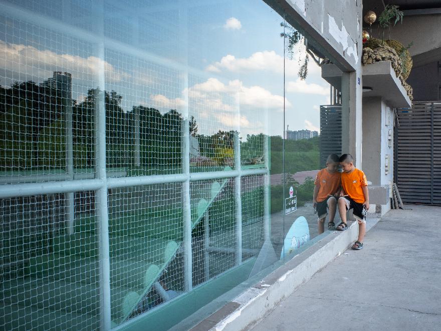 7月10日,成都SKP。一位小朋友正透过玻璃窗,好奇地看着儿童乐园里玩耍的其他同龄人。