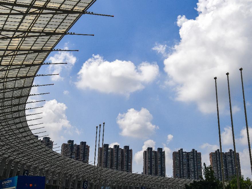 7月10日,世纪城会展中心。澄澈蓝天上,白云如棉絮般缓缓飘过。