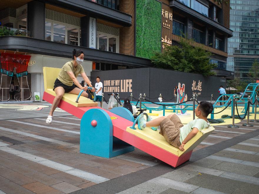 7月8日,交子大道。一对母子在商场外的公共游乐区域玩跷跷板,一上一下间满是亲子互动的温馨。