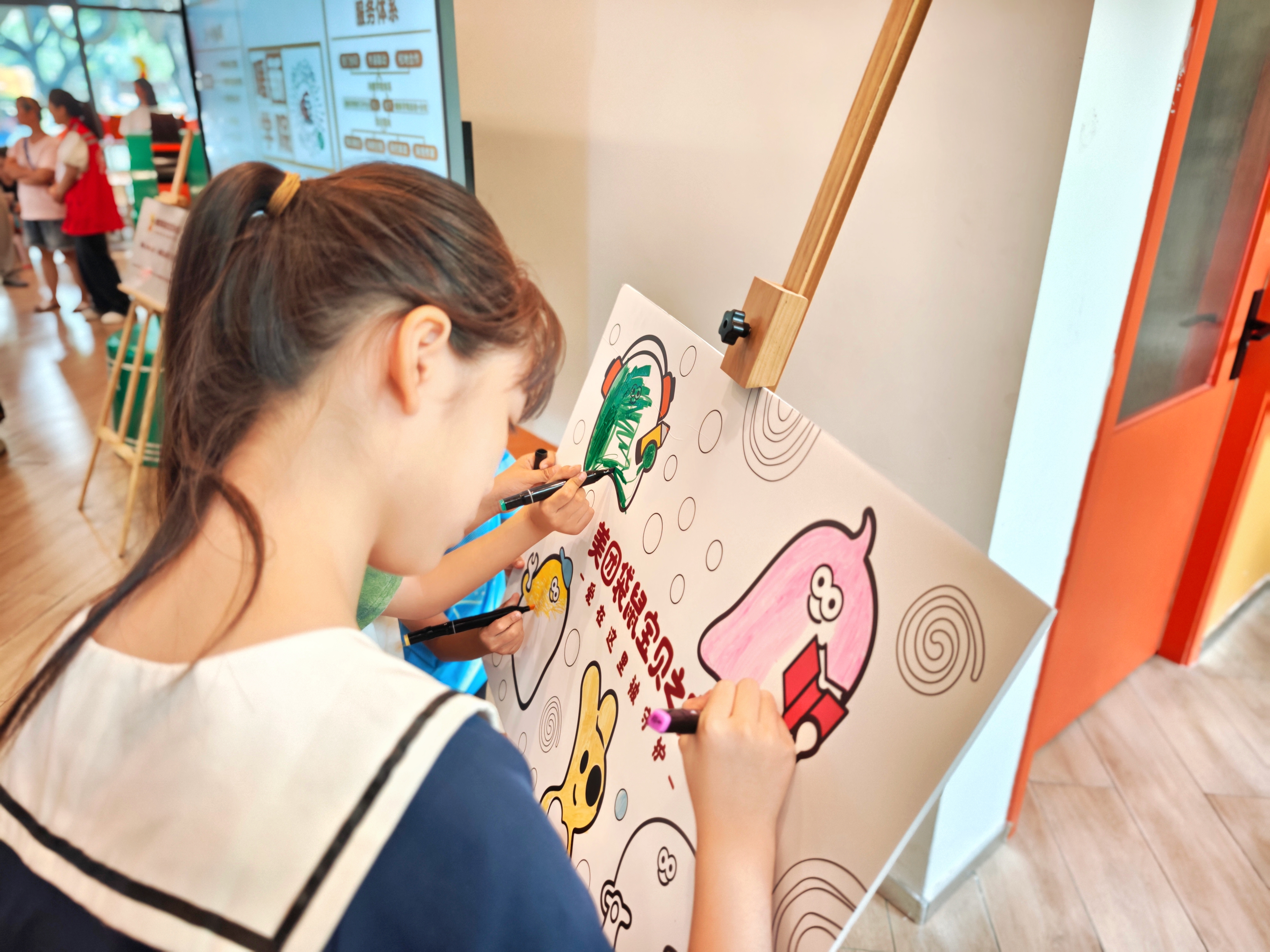 启动仪式上,骑手及其子女代表共同为肖家河站揭牌,辖区儿童以涂鸦方式启动项目,现场氛围温馨热烈。