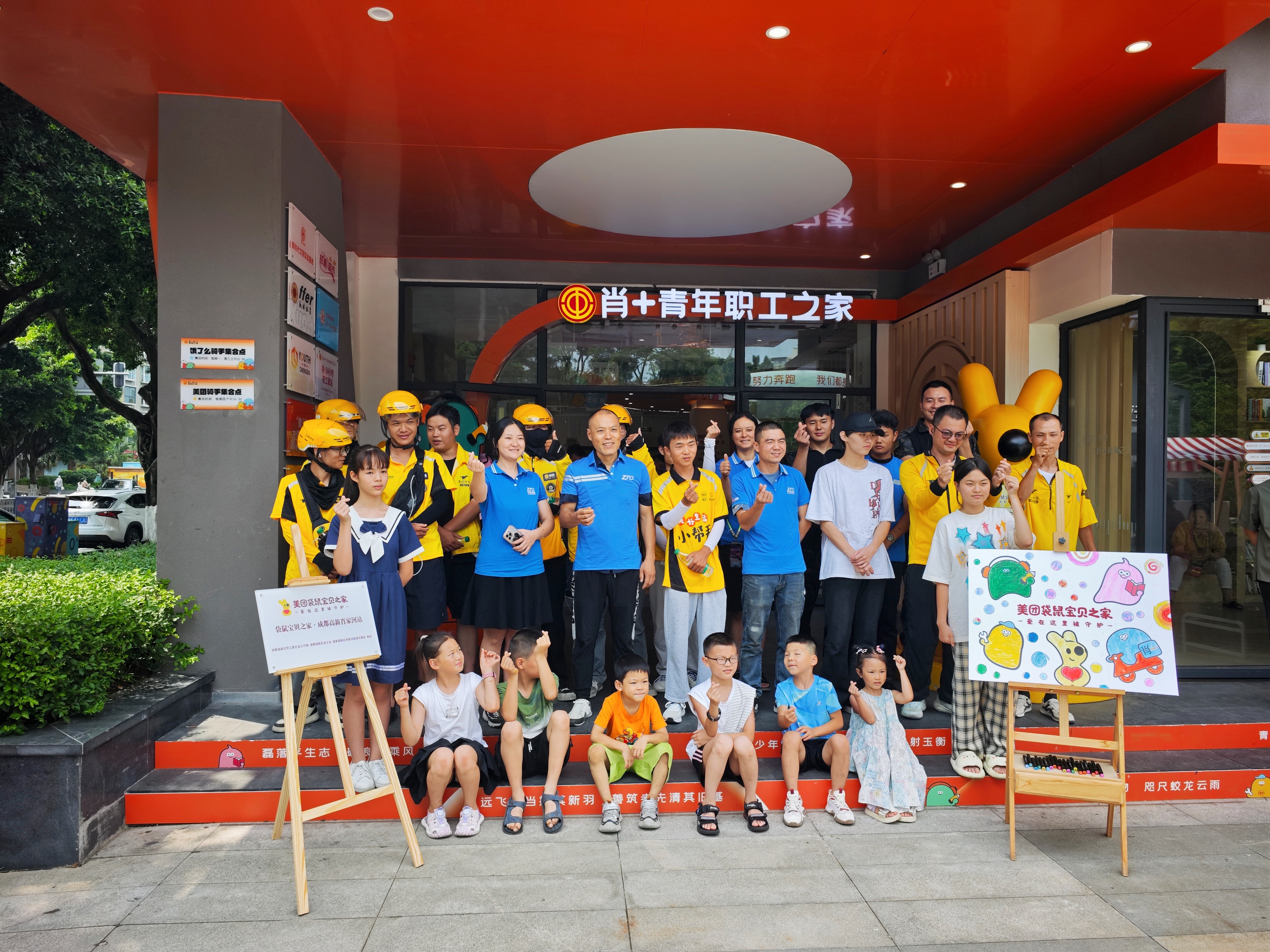 骑手及其子女代表共同为“袋鼠宝贝之家·成都高新肖家河站”揭牌