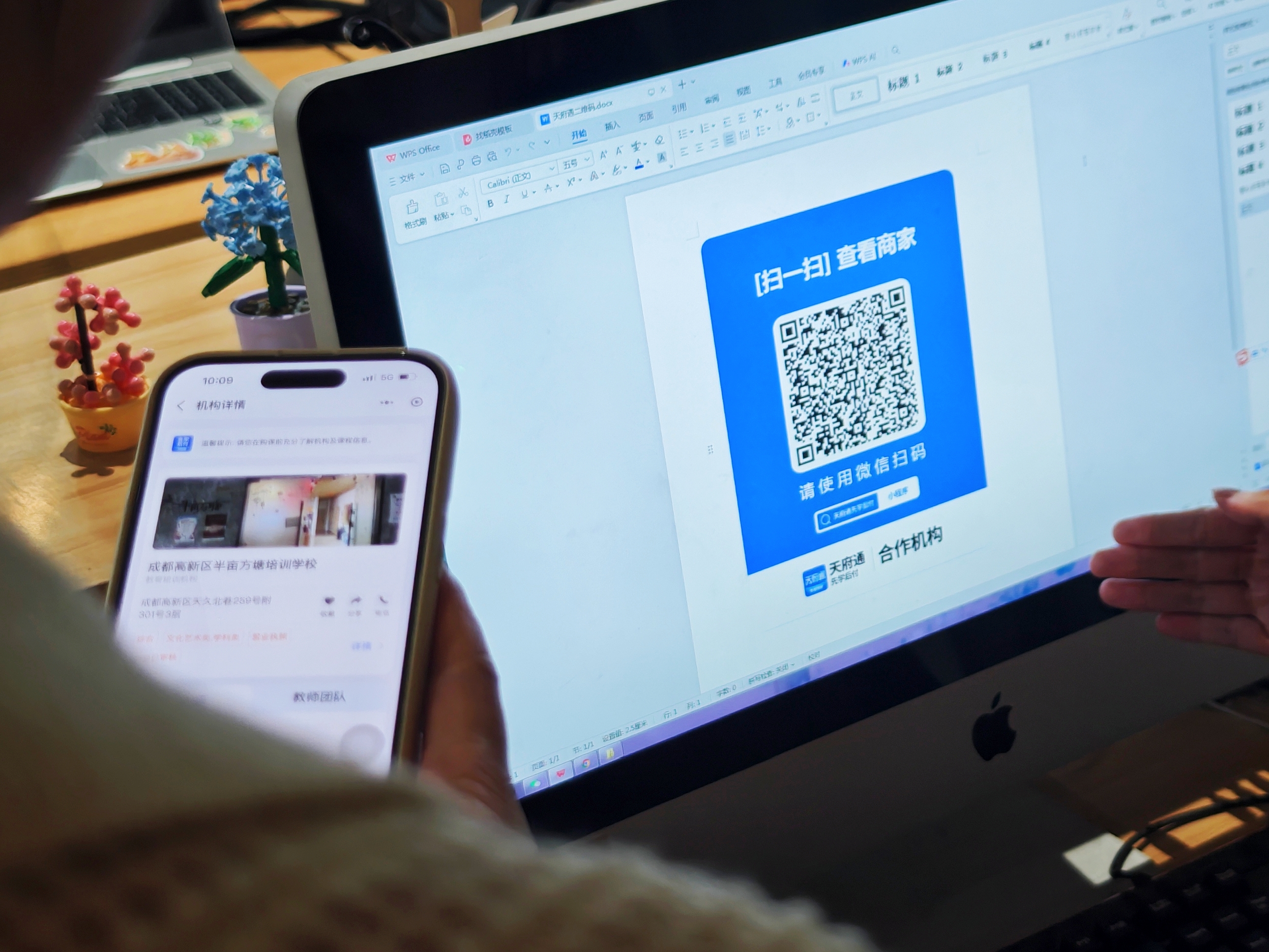 在成都高新区半亩方塘培训机构,家长熊星通过“天府通先学后付”小程序,可一键查询机构资质、课程及收费信息。“操作简单,交易记录透明,每笔消费后都能实时查看剩余课时和有效期。”熊星说。