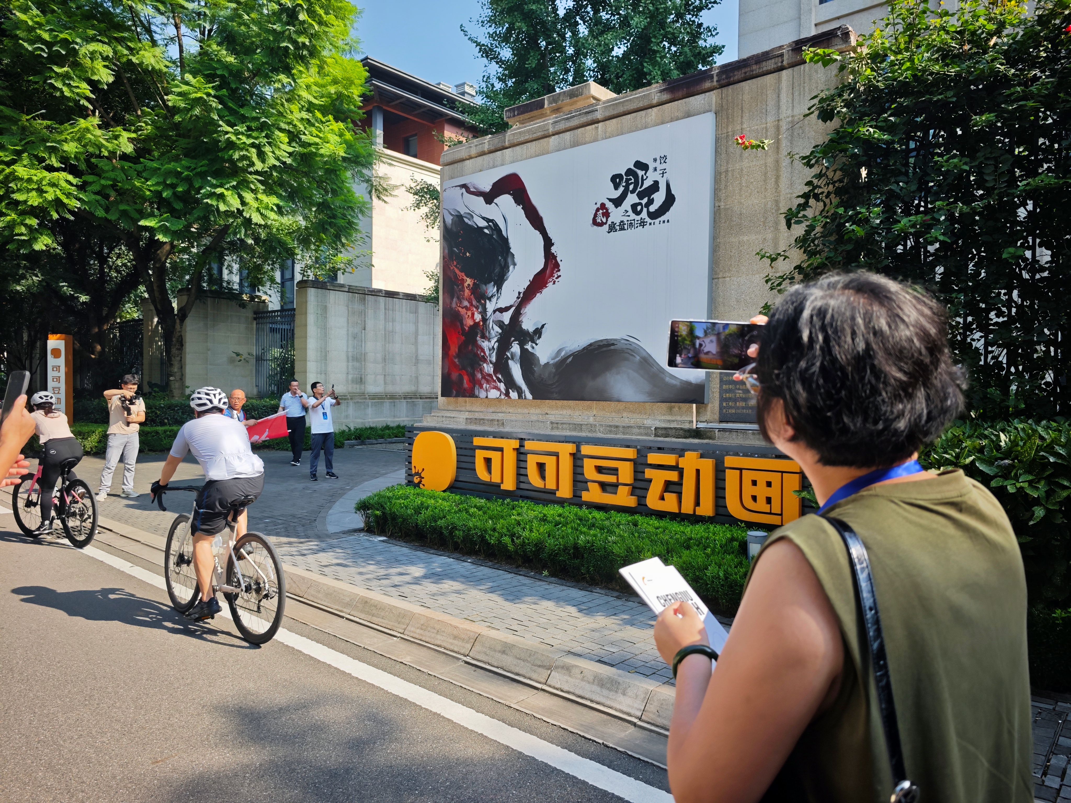 从展馆步入园区内,漫步在林荫密布、宁静悠然的小道间,媒体代表团来到可可豆动画的大楼前。自从以《哪吒》系列电影收获无数口碑后,可可豆动画公司门外不时就有“哪吒迷”前来打卡。当天参观至此处,大家开始集体打卡,依次和“哪吒”合影。《千岛日报》记者刘兰玲欣赏着手机里的照片,心满意足地说:“《哪吒之魔童闹海》上映时我连刷三次,非常喜爱哪吒这个热血少年的人物形象。这次有机会来到哪吒‘诞生地’打卡,收获了满满的意外惊喜”。