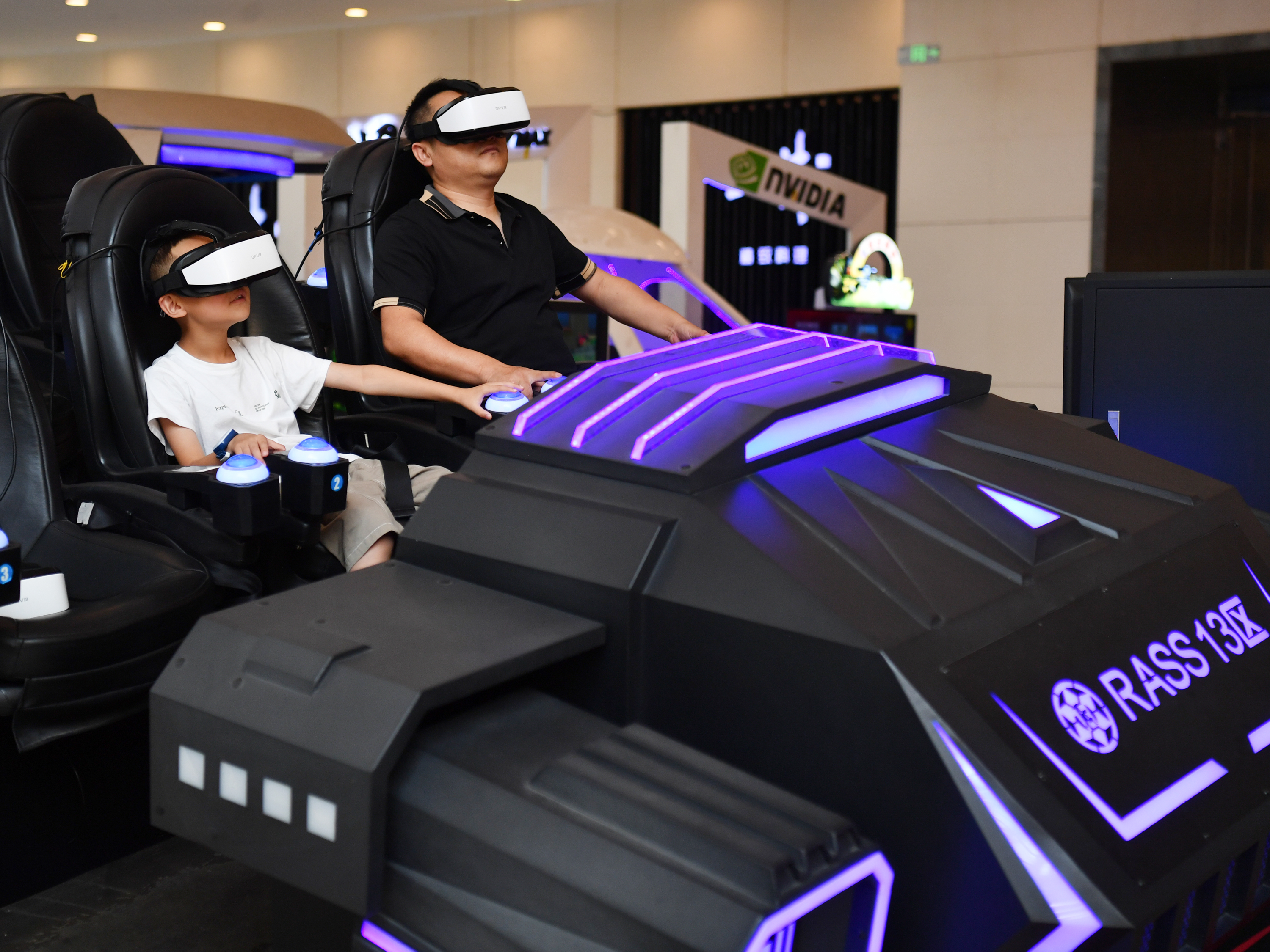 7月29日,环球中心。一对父子在商场内体验VR游戏,享受室内清凉舒适的环境。