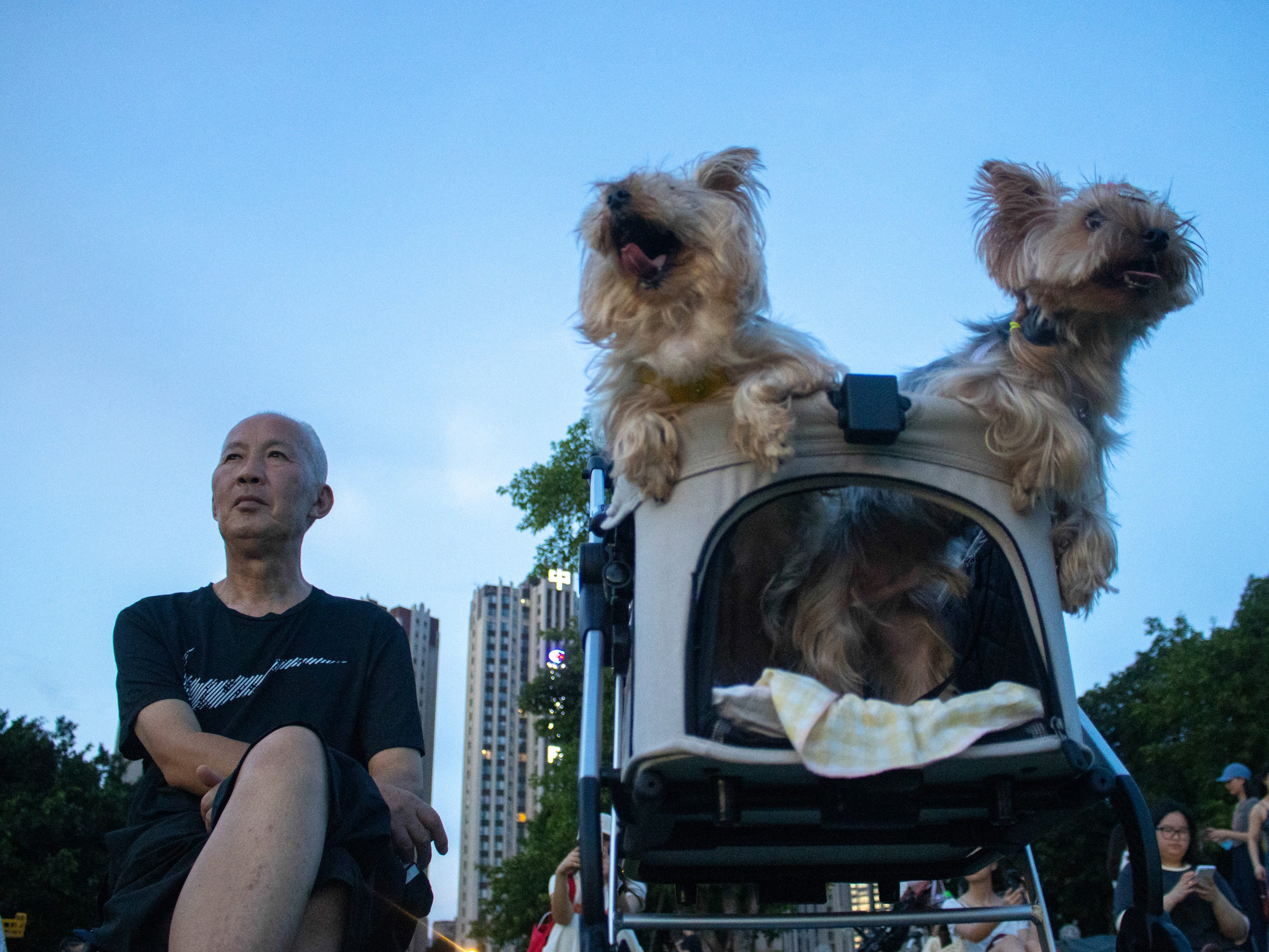 7月31日,锦城湖2号湖区。傍晚时分,老人和宠物在湖边纳凉看晚霞。
