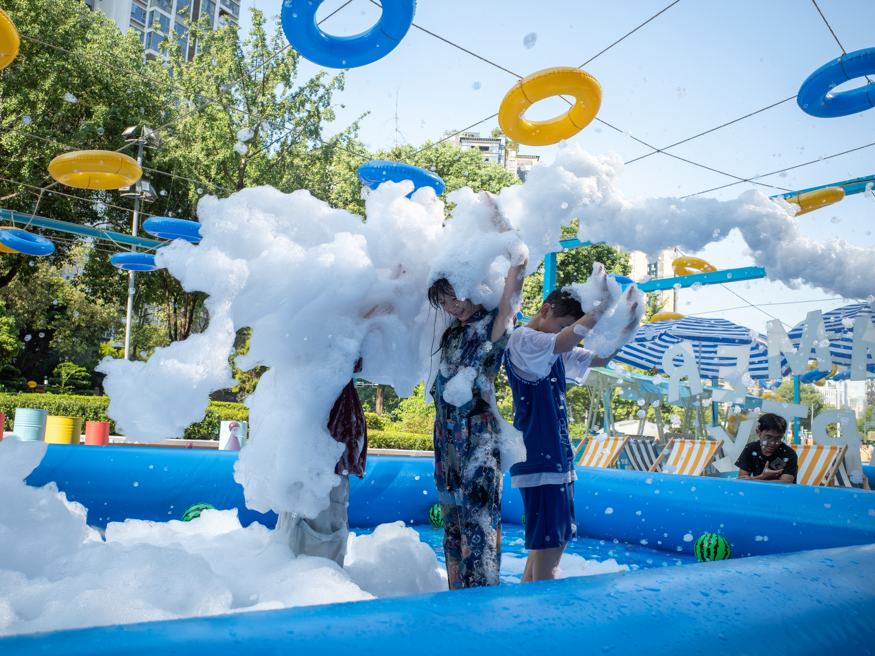 7月30日,世豪广场。小朋友们在玩“泡泡大作战”,泡泡好像一片片云朵。