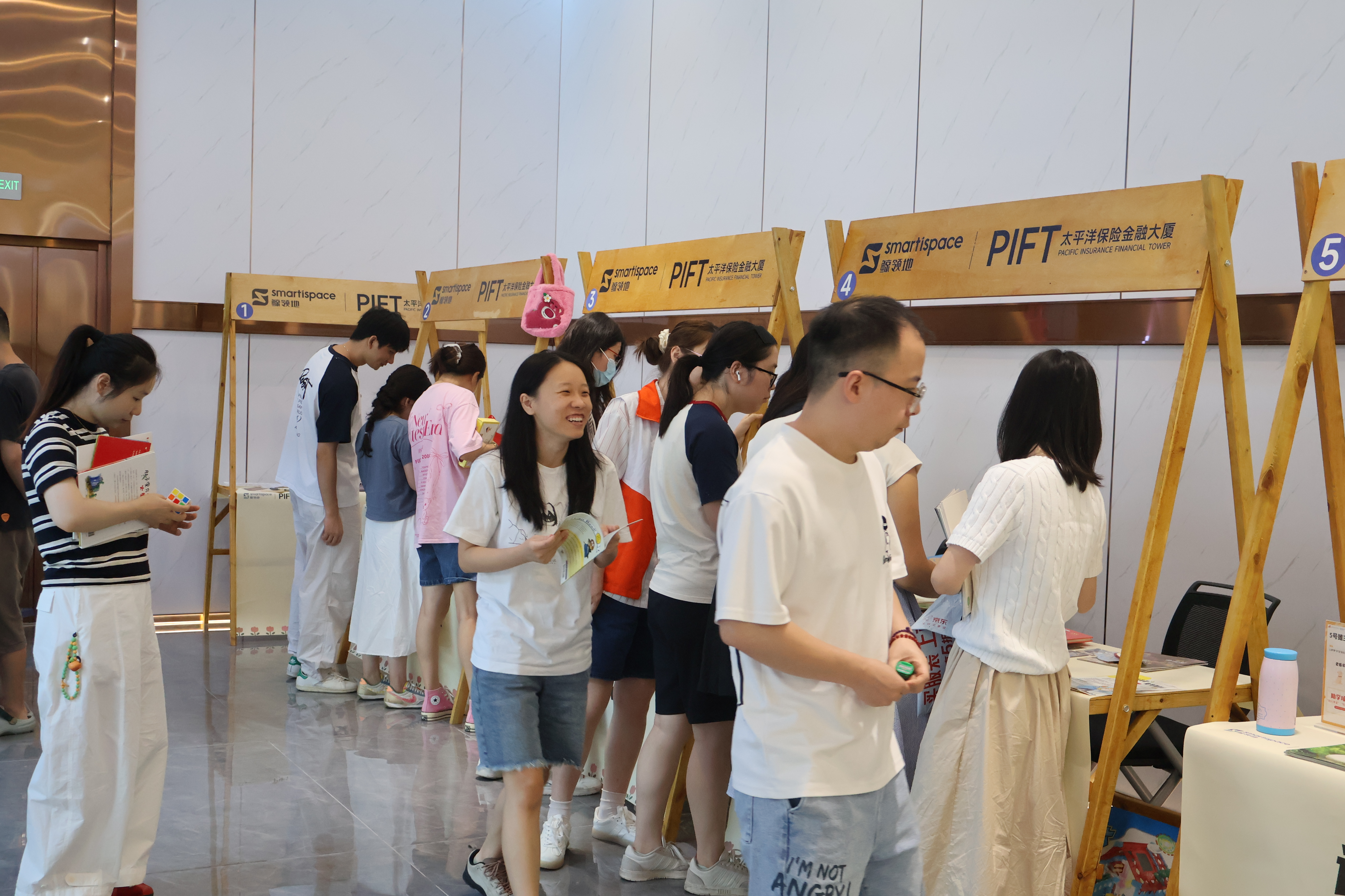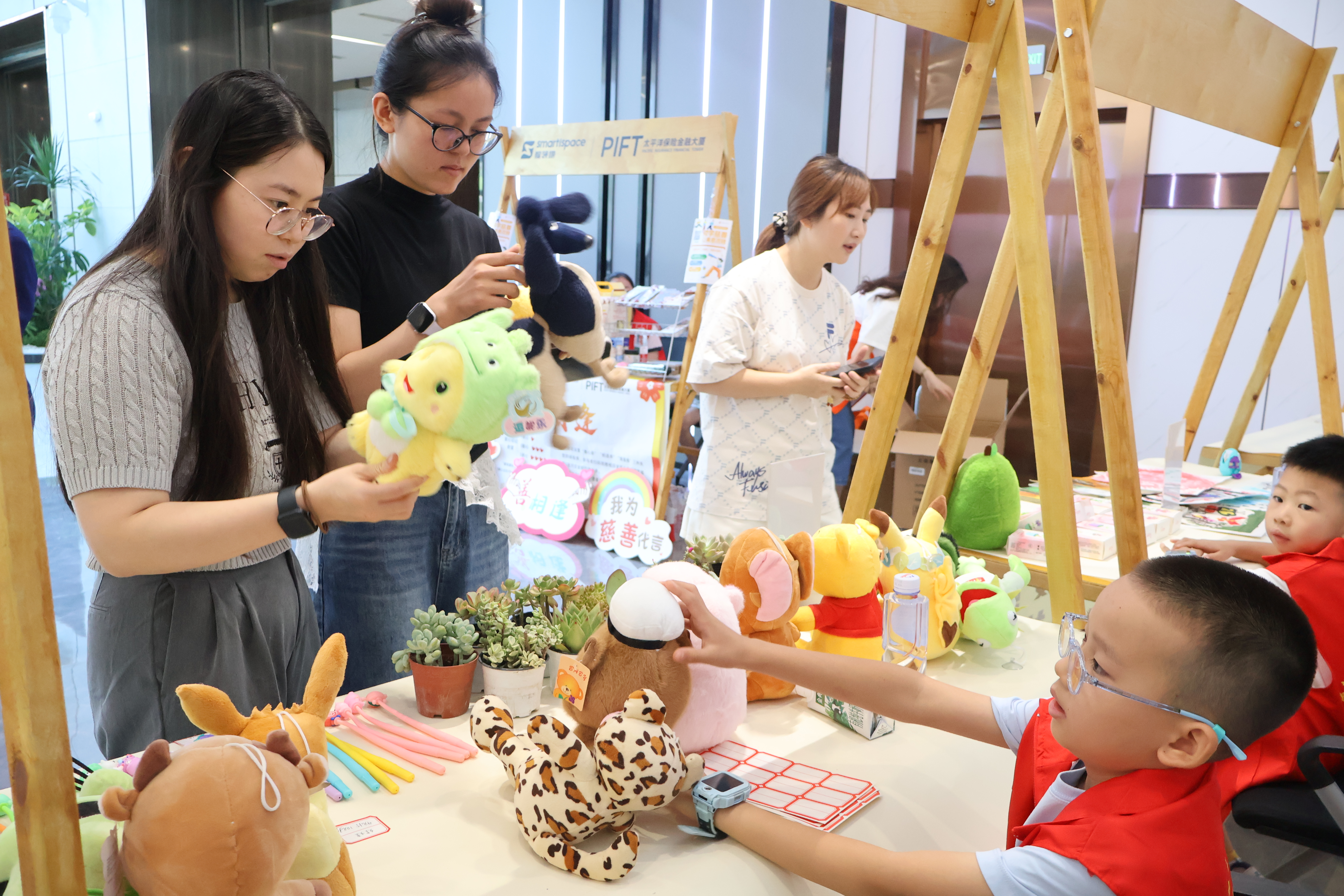 在成都太平洋保险金融大厦内,午休的企业职工们扫码捐款后,可收获来自爱心企业和孩子们制作的绘画、手工作品;上班间隙,员工们可通过趣味慈善游戏奉献爱心;小小志愿者们化身“助学使者”,热情讲解慈善项目……