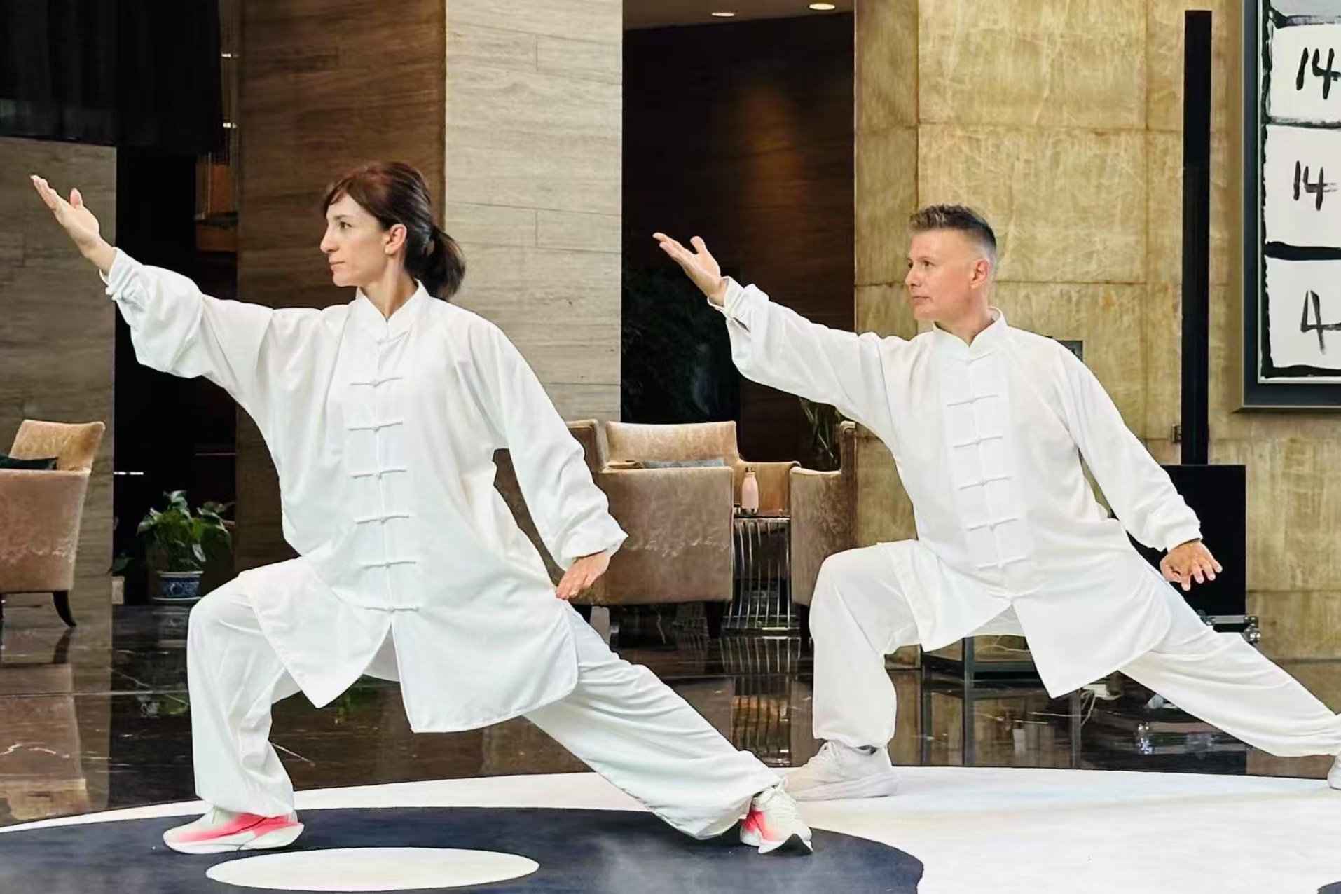 期间,几位外国友人也加入其中,他们虽然动作稍显生涩,却全神贯注,在一招一式里感受东方哲学韵味。周围还有不少国内外友人驻足欣赏,有的静静聆听琴音,有的专注凝视太极招式,眼神里满是好奇与赞叹。传统韵味与现代空间奇妙融合,让宾客们感受文化的独特气韵。