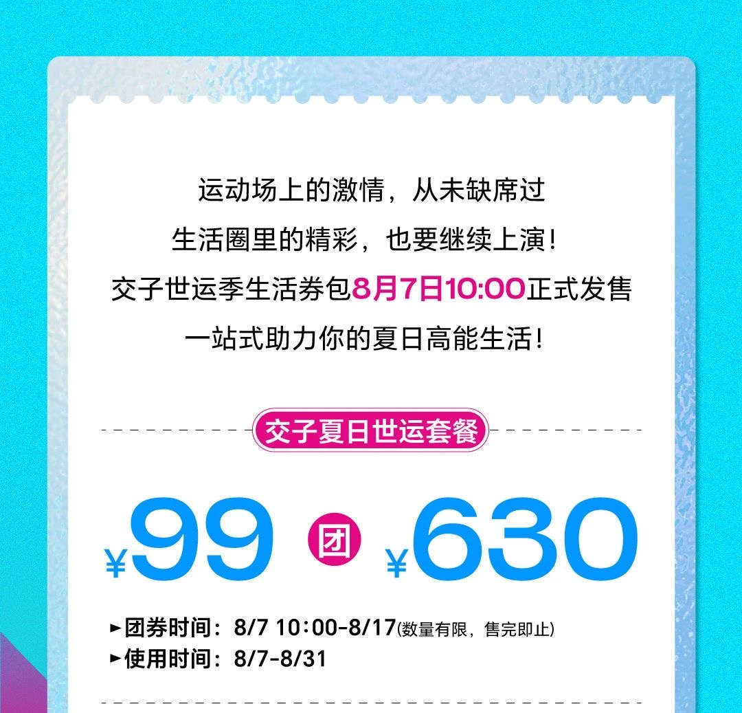 在消费优惠方面,“交子夏日世运套餐”将于8月7日10:00至8月17日发售,售价99元(原价630元),使用时间为8月7日至8月31日,活动期间单个ID限购1份。该套餐包含美食券、饮品券及单人畅享券,其中美食券可在“拾谷”“MADO”等9家商户中任选1家使用;饮品券可在“MADO”“拾吾粤市”等7家商户中任选2家使用;单人畅享券可在“拾谷”等多家商户使用。具体兑换详情可登录“交子大道”小程序,点击“团购-券”查看。