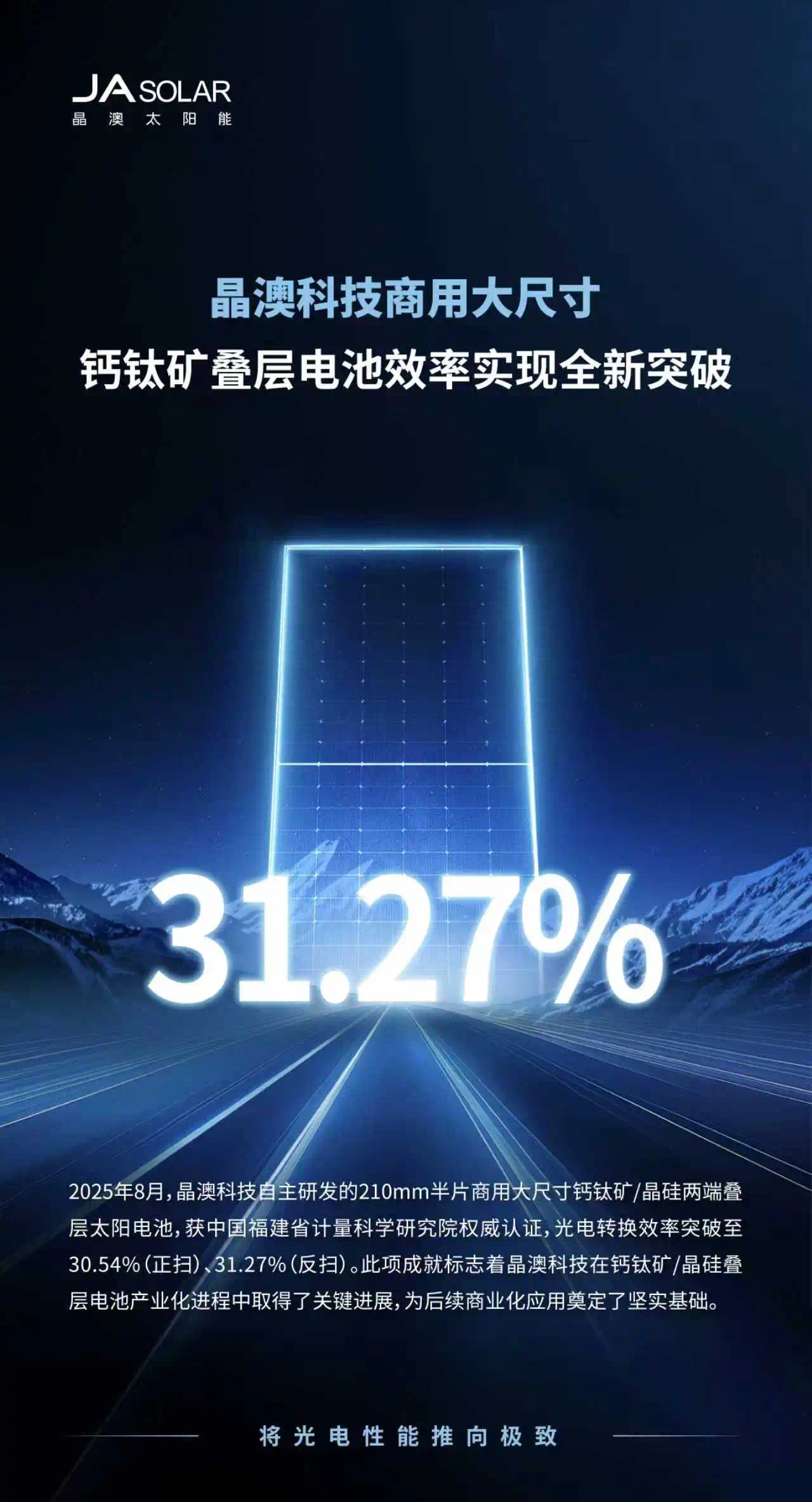 当前,随着全球能源结构的转变和人们环保意识的提高,太阳能电池愈发受到关注。9月1日,记者获悉,商用大尺寸钙钛矿叠层太阳能电池效率近日迎来了技术突破——成都高新区企业成都晶信明能光伏科技有限公司(以下简称“晶信明能”)自主研发的210mm半片商用大尺寸钙钛矿/晶硅两端叠层太阳能电池,获中国福建省计量科学研究院权威认证,光电转换效率突破至30.54%(正扫)、31.27%(反扫),这一突破标志着以钙钛矿电池为代表的“下一代电池”产业化进程有望进一步加快。