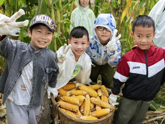 带着劳动成果返回休息区后,现场随即开展煮玉米环节。当香喷喷的玉米被捞出分发给每个孩子时,大家迫不及待地品尝起来,纷纷表示“自己掰的玉米格外香甜”。活动尾声,老师表扬孩子们的积极表现,并再次向大家介绍了珍惜粮食的重要性。此外,现场还设置了“我的玉米”成果展示区,孩子们将自己掰的玉米摆放整齐,相互交流分享,氛围融洽。