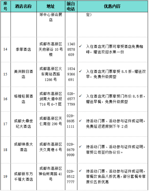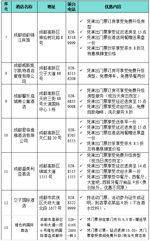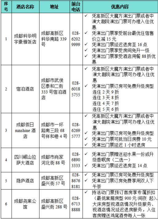观众凭成都高新中演大剧院、成都金融城演艺中心的演出票根,即可享受酒店住宿、餐饮的专属优惠(具体优惠详见文末表格)。