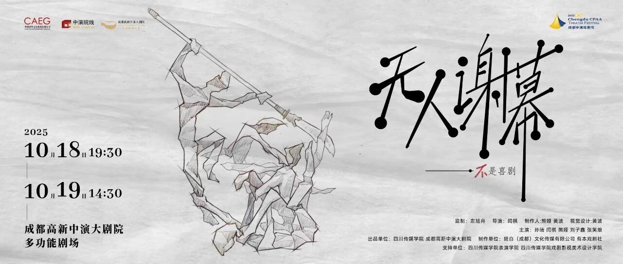 话剧《无人谢幕》以寓言式的荒诞手法,探讨“如何活着”的命题。故事发生在明令禁止娱乐活动的“亡灵中转站”,四个带着宿怨的亡魂狭路相逢,被迫接受定罪官的考验——“排好一出话剧,便可重返人间”。在排练过程中,旧爱、背叛与权欲交织,排练逐渐演变为欲望的角力,真相层层揭开,“重生名额”也成为你死我活的战场。全剧通过讽刺与残酷的叙事,叩问人们对死亡与存在的思考,折射每个人心中对生命的追问。