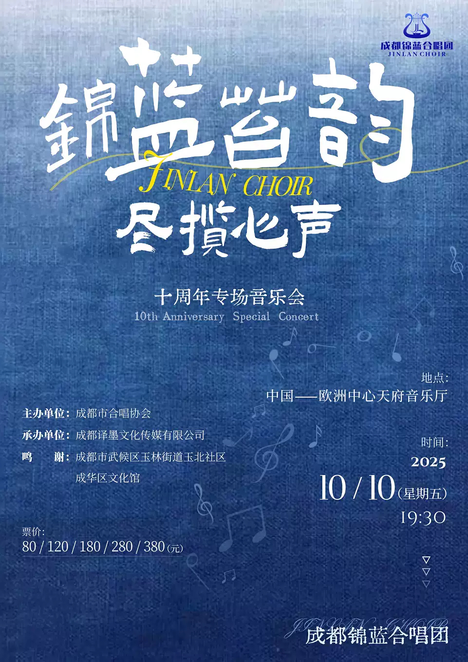 成都锦蓝合唱团以10人小团起步,如今已发展至50人规模。成员来自各行各业,却因对音乐的共同追求汇聚一堂。十年来,他们在歌声中记录生活的烟火气息,也在合唱中传递温暖与力量。本次音乐会将带领观众在悠扬旋律中,感受心灵与艺术的同频共振。