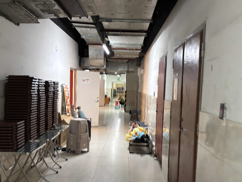 隐患1:负一层后场疏散通道内堆放较多杂物,设置人员休息床铺