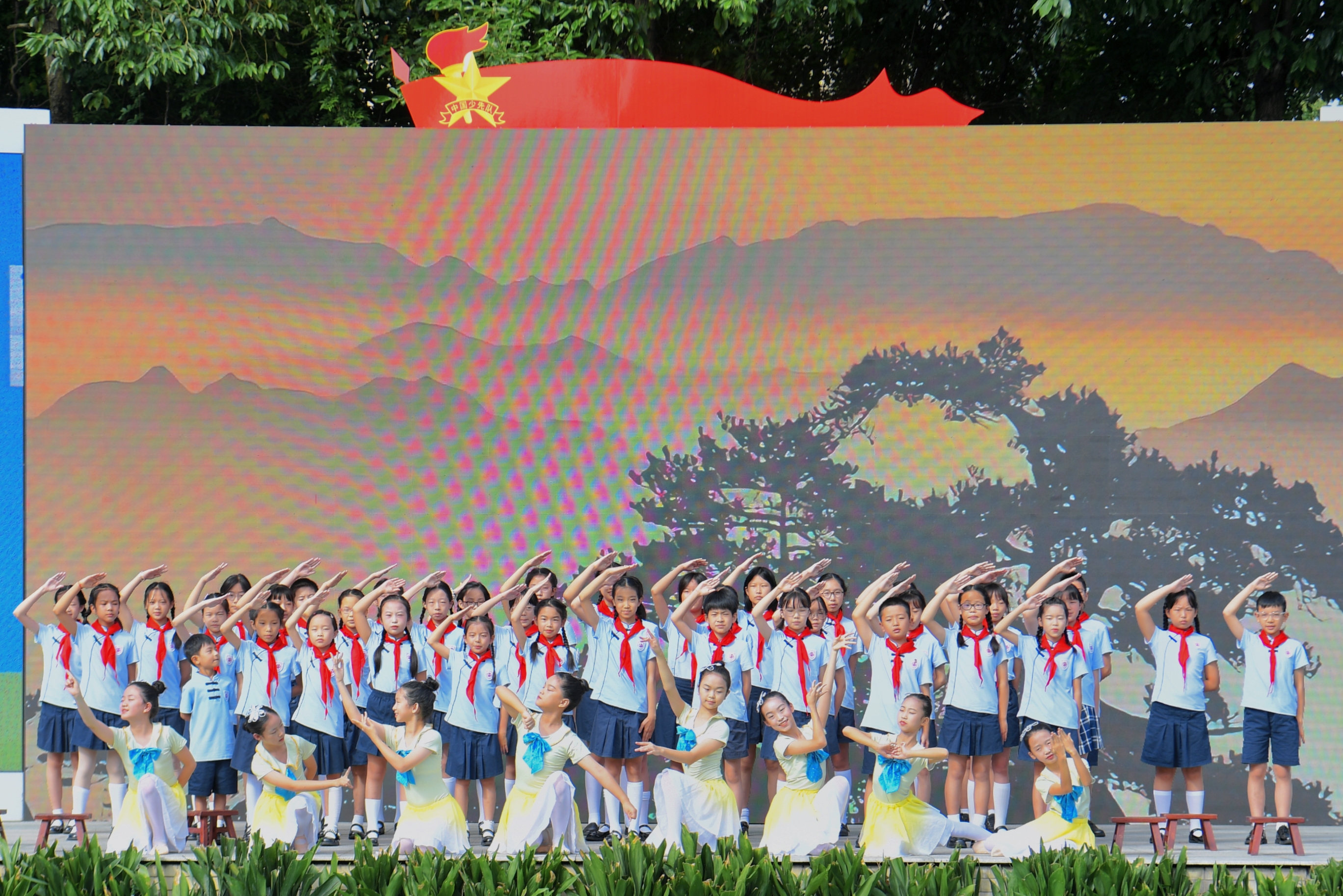 随后,主题展演精彩纷呈。由区内多所小学带来的舞台剧《门前有棵树》、群体朗诵《铭记历史,展望未来》、舞蹈《闪闪的红星》等节目,深情演绎红色故事,展现了少先队员们昂扬向上的精神风貌。