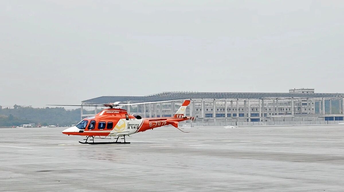 当日,在计划起飞前一小时天空飘起了细雨,但起降点能见度和云底高始终保持在飞行标准之上。上午9点30分,沃飞长空的橙红色阿古斯塔AW109型直升机准时从中国-欧洲中心楼顶起飞。起飞的同时,该飞行任务ID代码图标出现在民航二所北斗公司研发的“低空飞行运行保障系统”界面上,一条红色虚线清晰勾勒出它的航迹。直升机向东穿越龙泉山脉,直奔示范验证机场。9点42分,伴随着由远及近的轰鸣声,“来了!来了!”现场响起阵阵欢呼声。全程仅用12分钟,直升机便稳稳降落在指定起降点,为民航科技创新示范区迎来了首位“空中访客”。10点整,直升机按计划安全返航。