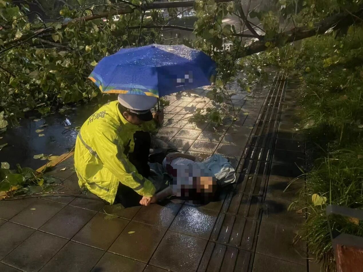 情况紧急,余光曦与王建勇迅速分工:一人向指挥中心报告并请求120支援,另一人查看伤情,确认树干并未直接压在女生身体上后,两人小心将其移至安全地带,又从警车取来雨伞、雨衣,为女生遮雨、保温。
