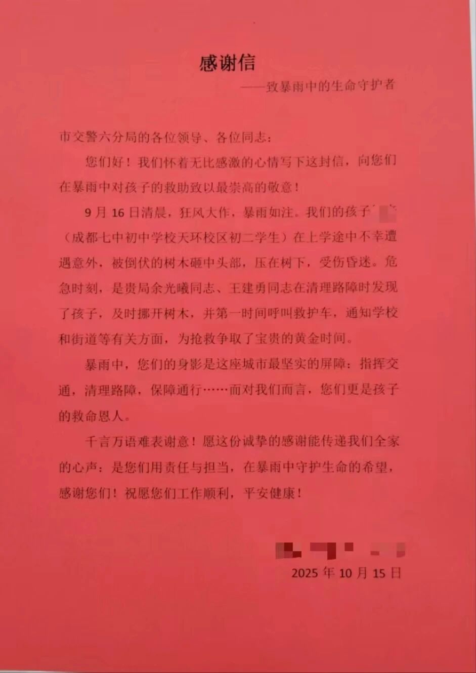 “暴雨中,你们的身影是这座城市最坚实的屏障,而对我们而言,你们更是孩子的救命恩人。”10月15日,徐同学与父母一同来到成都交警六分局,将一封满载深情的感谢信和一束鲜花送到两位交警手中,并表达一家人真挚的谢意。这温暖的场景背后,藏着一段发生在暴雨天的暖心救助故事。