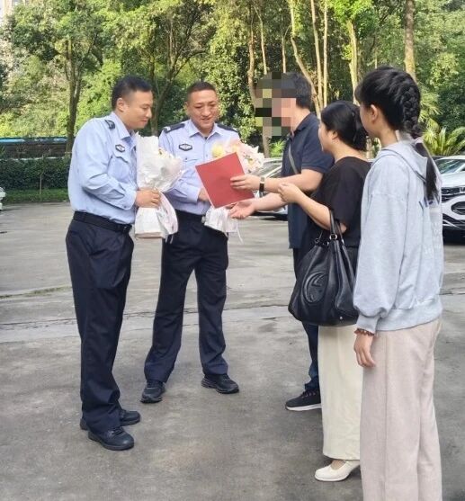 经过近一个月的治疗,被救助的徐同学顺利康复出院。这段时间里,她和父母始终记挂着暴雨中挺身而出的两位交警,一心想着要向他们表达感谢。当天,徐同学在父母的陪同下,专程来到成都交警六分局,将准备好的鲜花和感谢信送到余光曦与王建勇手中,便有了开头那感人的一幕。