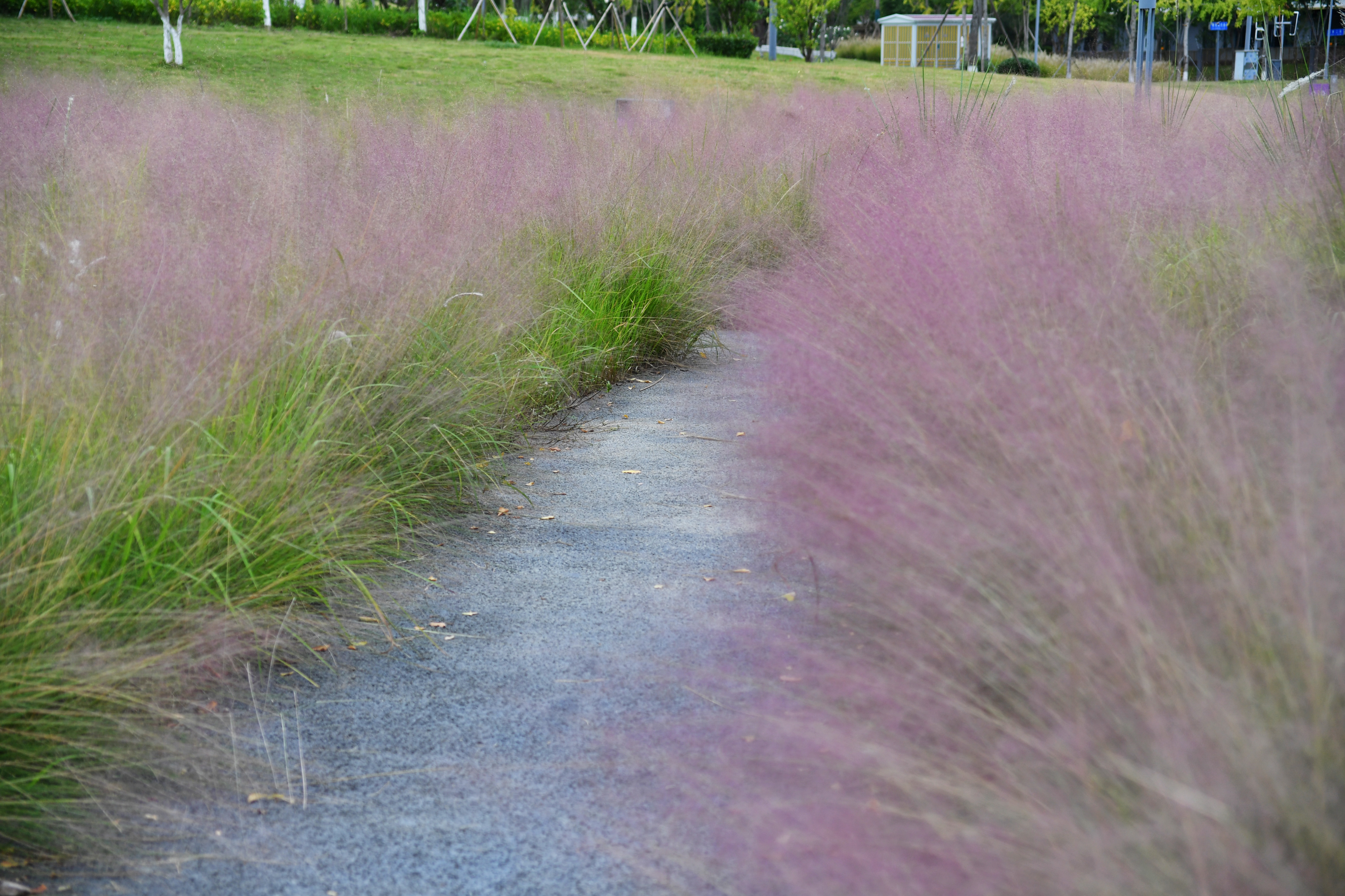 在和惠二街与新程南四路口,成片的粉黛乱子草如烟似雾,绵延成一片温柔的粉色海洋。微风拂过,草穗轻轻摇曳,仿佛给大地披上了一层梦幻的薄纱,吸引不少市民驻足拍照。