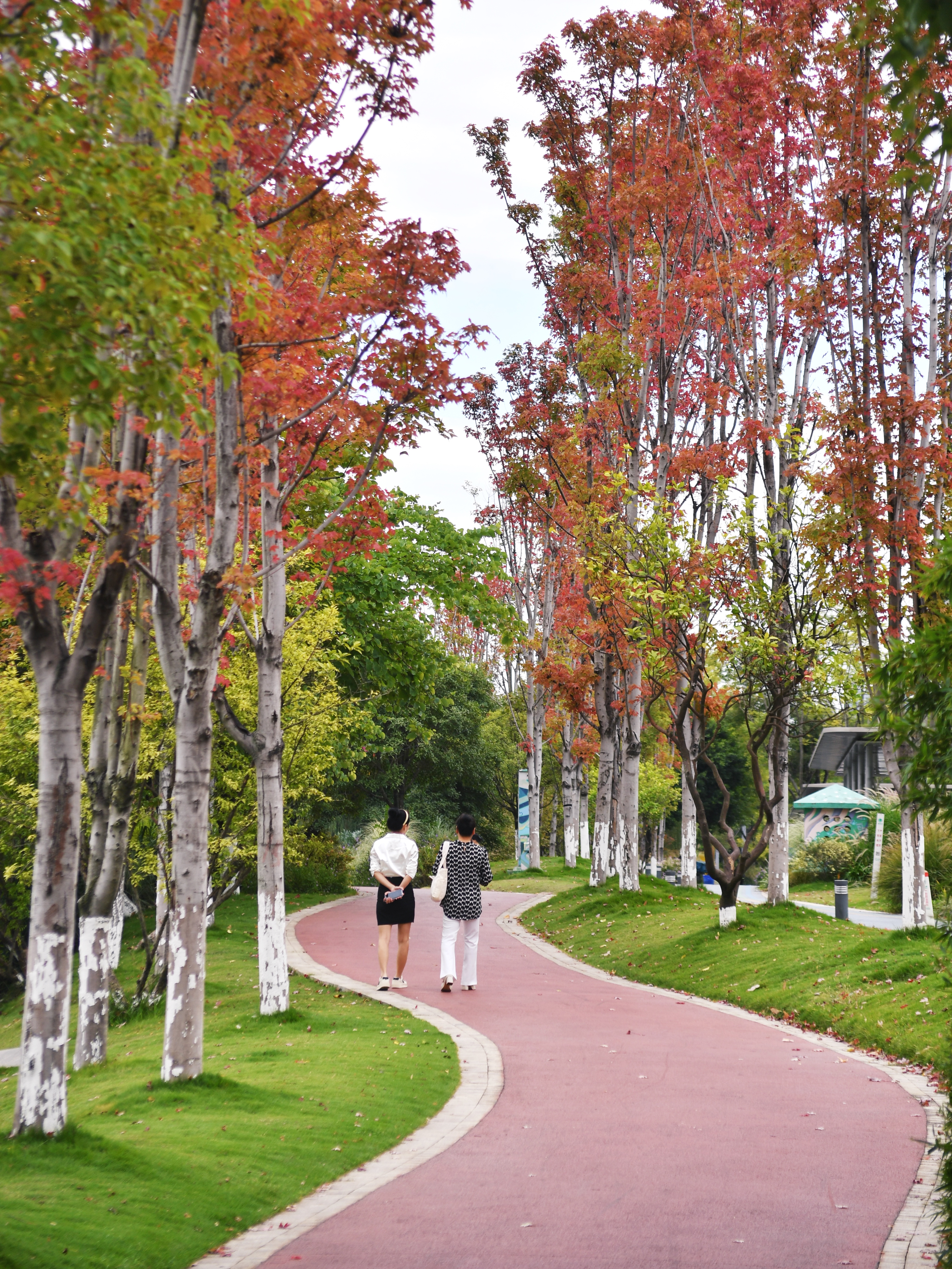 在新川之心公园西区,红枫已成为当前最引人注目的景观。枫叶渐次转红,层层叠叠,如火如荼,与园内的湖泊、小桥相映成趣,构成一幅浓墨重彩的秋日油画。市民们或漫步林间,或坐在长椅上静静欣赏,偶有落叶飘下,更添诗意。