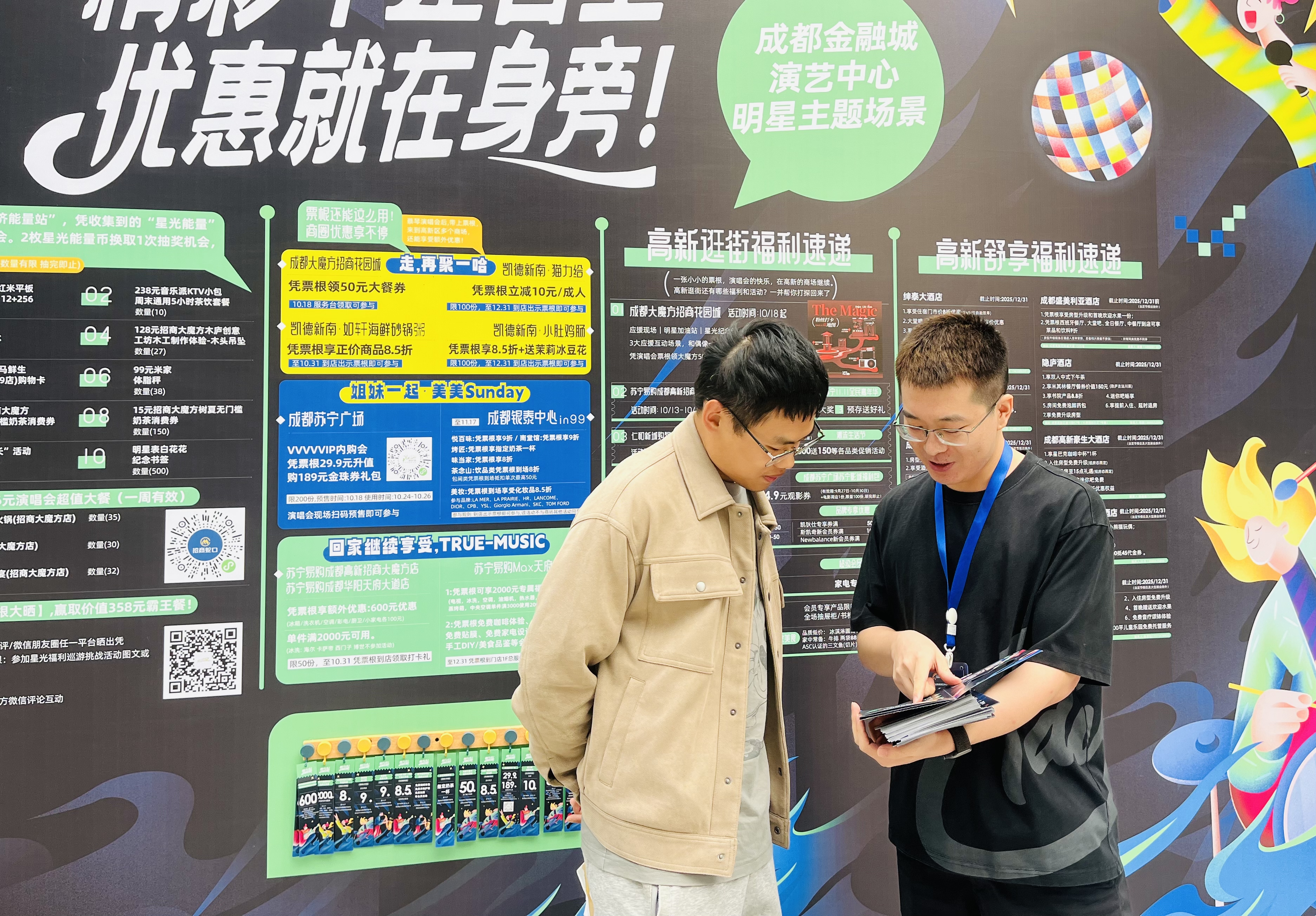 周边商圈也同步推出一系列优惠举措,成都大魔方招商花园城不仅对商场会员提供周末及法定节假日免费停车服务,持演唱会票根的观众还能到客服台领取50元消费券,该消费券可用于餐饮消费;此外,凯德新南、成都苏宁广场、成都银泰中心in99、苏宁易购等多家商场都推出了餐饮、奶茶咖啡、珠宝、美妆、家电等各种品类的票根专属福利。观众观演后还可参与抽奖赢取霸王餐、演出门票等福利,实现“住宿+观演+餐饮”的多重体验。