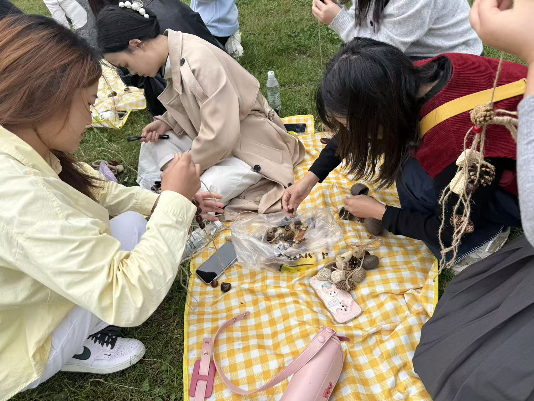 中和湿地公园草木葱茏,垂柳依依,为这场文化手作活动铺就了充满自然气息的底色。大家围坐在草坪之上,认真聆听活动讲解,随后便兴致勃勃地投入到风铃手作环节中。大家或两两协作,或三五成群,手中的麻绳、秋果等材料在巧手下渐渐成型。有的青年专注于绳结的编织,眼神里满是认真;有的青年则在互相交流创作灵感,现场欢声笑语不断,氛围十分浓厚。青年们时而低头细致缠绕麻绳,时而举起半成品互相展示,彼此间的协作与交流让距离悄然拉近。