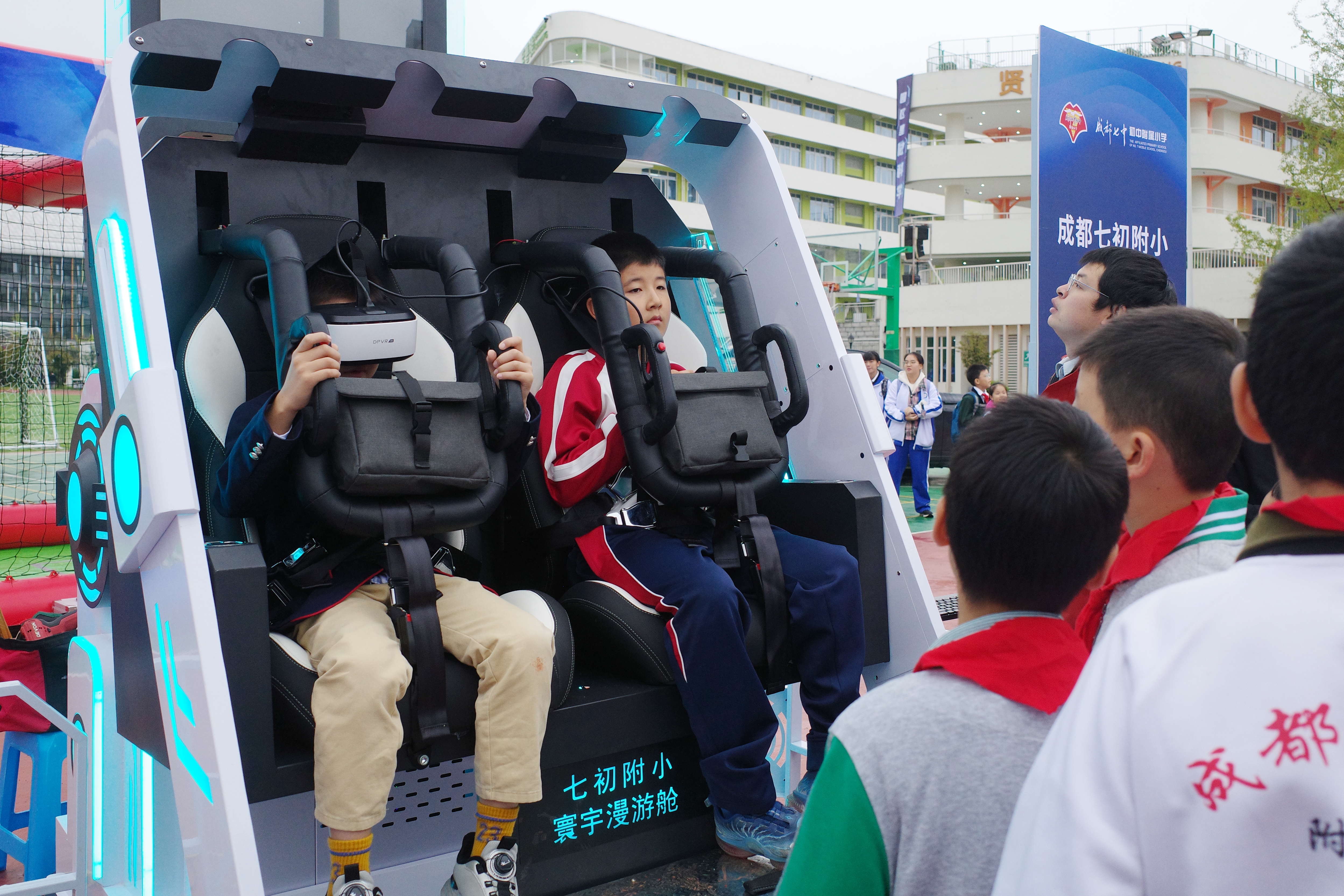 在学校操场上,来自成都高新区的10所青少年科学院分院及全区中小学展区,还集中呈现了学生们的原创成果。可降解包装模型、智能节水装置、《火星移民村》科幻画等作品,展现了学生们丰富的创造力,VR太空舱、3D打印展台等体验项目则让学生们近距离感受到了科技的魅力。