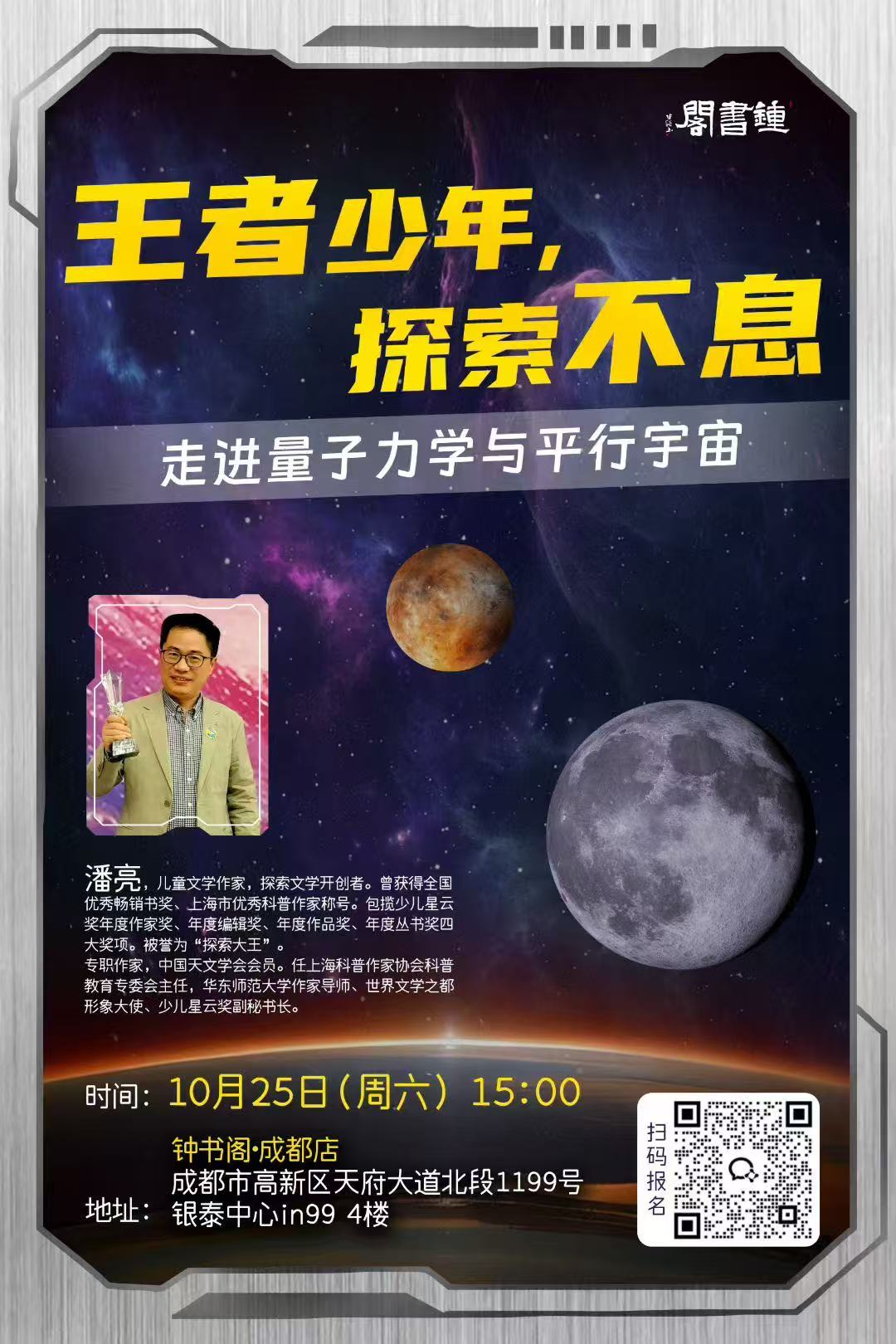 儿童文学作家、探索文学开创者潘亮将以代表作《王者大陆历险记》为引,带领读者走进量子力学与平行宇宙的奇幻世界,讲解多重宇宙的科学奥秘,分享创作背后的灵感故事。活动现场还将设置趣味问答与精美礼品,让孩子在科学与文学的交汇中,激发想象力与探索欲,感受科学的魅力与阅读的乐趣。