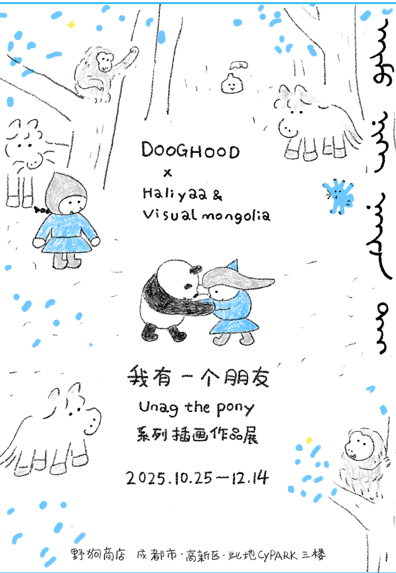 两位创作者以轻松简约、富有童趣的笔触,描绘草原上的男孩、女孩、小马及动物伙伴,展现游牧生活的诗意与温度。展览分为“找朋友”“水草丰茂的地方”“小马的新朋友” 三大篇章,涵盖毛毡插画、布面丙烯原画、手工作品与概念场景等多种形式,并特别融入了象征成都的大熊猫形象,让来自草原的小马在天府之地结识新朋友,于艺术与自然的融合中传递纯粹、温暖的友谊。
