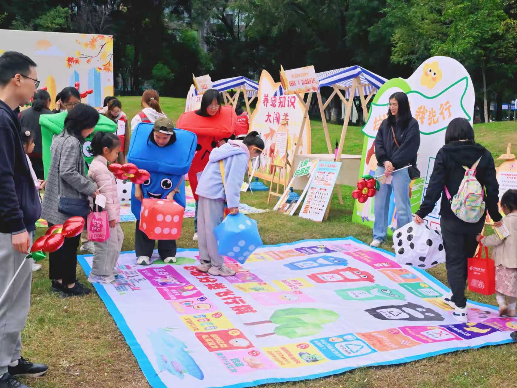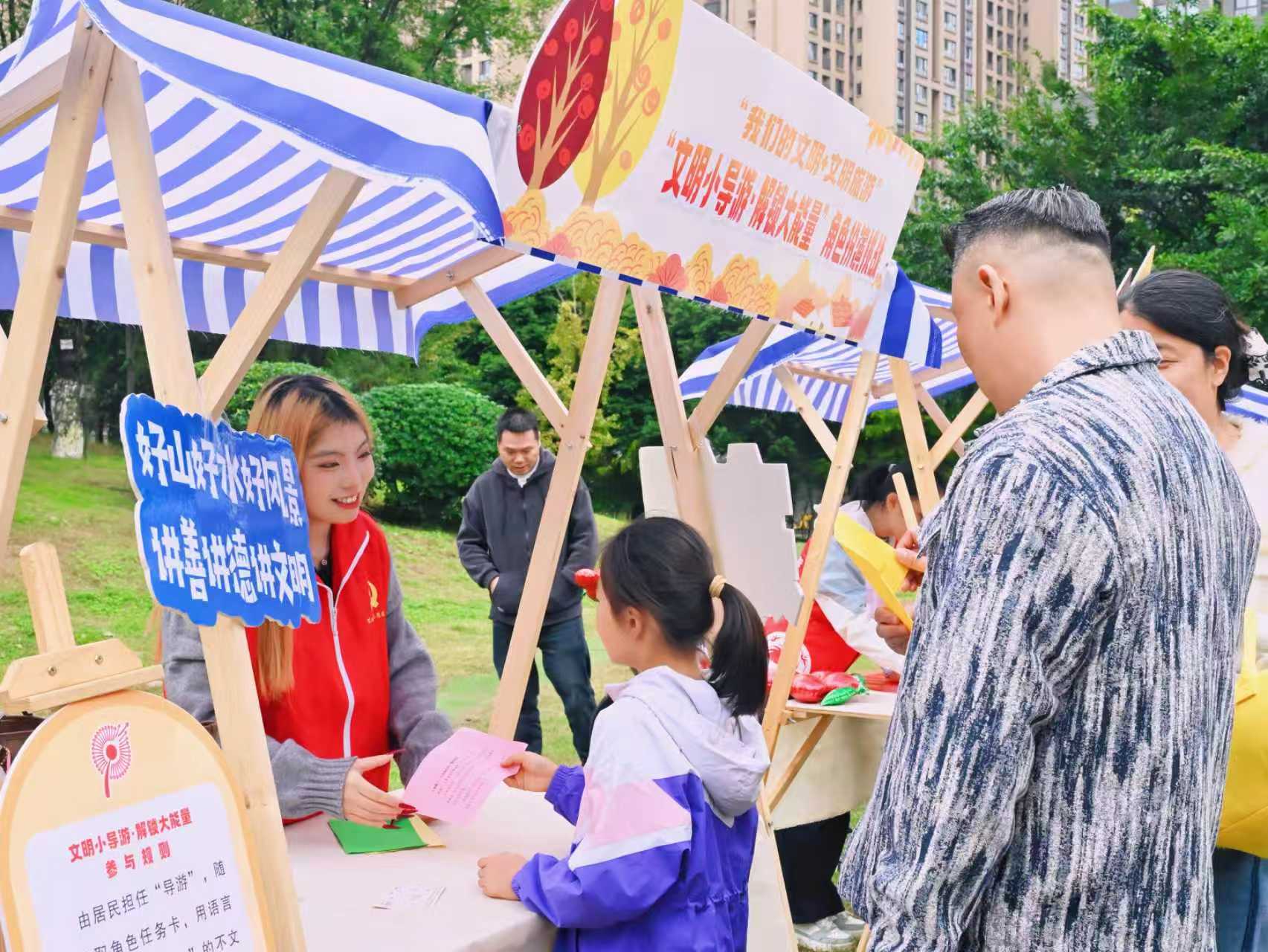 集市上,各个摊位前人头攒动,欢声笑语不断。“养宠知识大闯关”让居民在游戏中掌握文明养宠规范;“交通标志猜猜看”和“垃圾分类大富翁”等游戏,则让安全出行与环保理念变得轻松易懂。在“文明小导游”角色扮演区,居民通过模拟情境学习如何得体地劝阻不文明行为;一旁的“文明观赏”承诺打卡墙上,贴满了居民们签名后留下的文明小红花,表达着践行文明公约、守护城市形象的共同决心。
