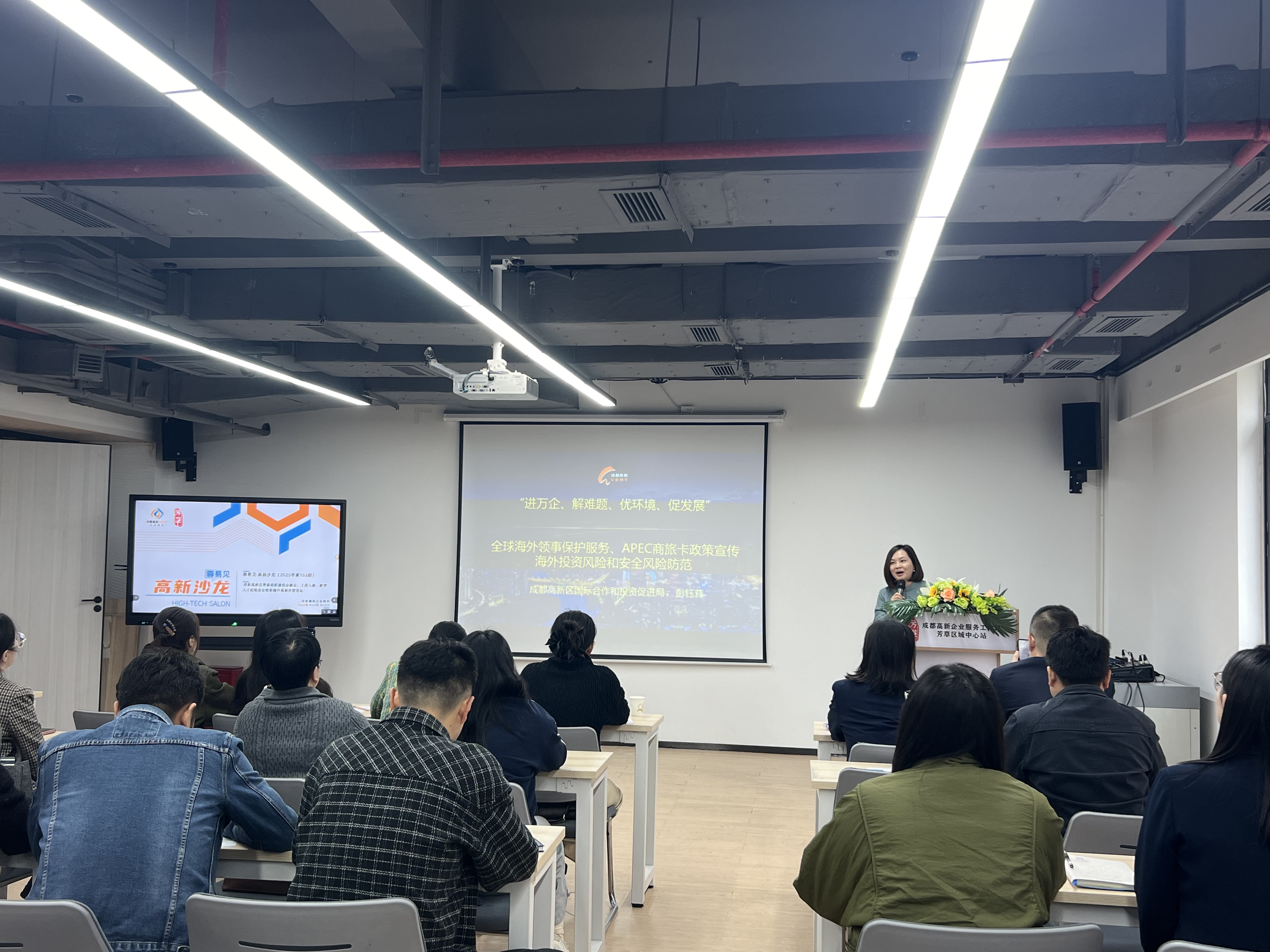 成都高新区国际合作和投资促进局工作人员结合经典实战案例,全面解析全球领事保护知识,分析海外形势,分享海外投资、安全风险防范措施,增强企业海外风险防范能力,助力企业构建海外安全防护网。同时,围绕APEC商旅卡政策进行宣讲,就APEC商旅卡所提供的“签证便利”“通关便利”“申办条件”等内容进行详细解读,助力企业安全、便利出海。