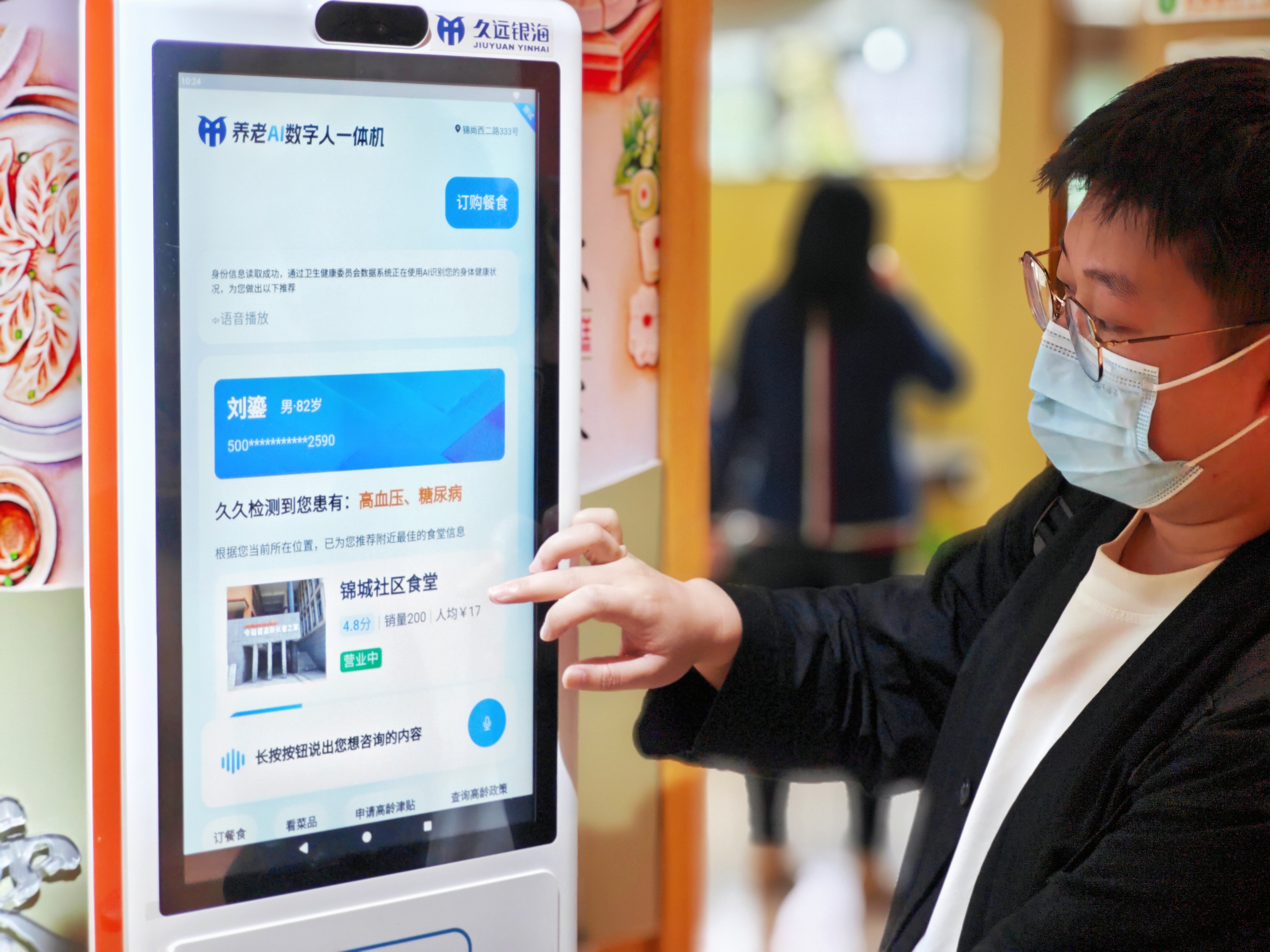都说药补不如食补,对老年人而言,健康营养的康养餐饮是一日三餐的重点。当天的养老机器人展演中,便有3款机器人分别负责老年人的膳食建议指南和烹制的工作。在高新长者之家的食堂门口,四川久远银海软件股份有限公司产品经理刘鎏演示了“智慧助餐数字人一体机”为老年人提供智能配餐服务的流程。